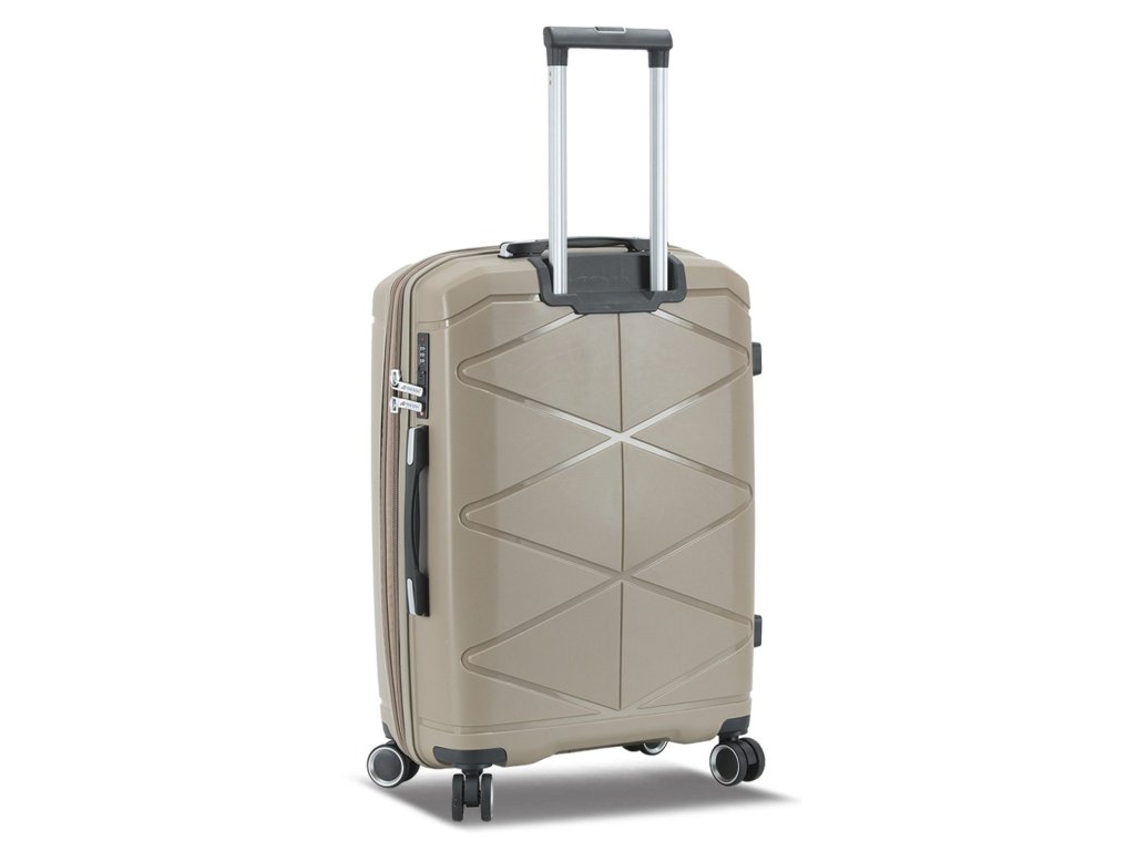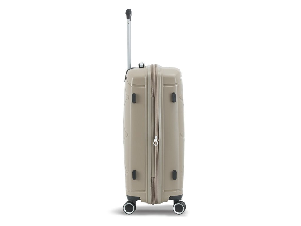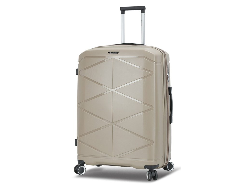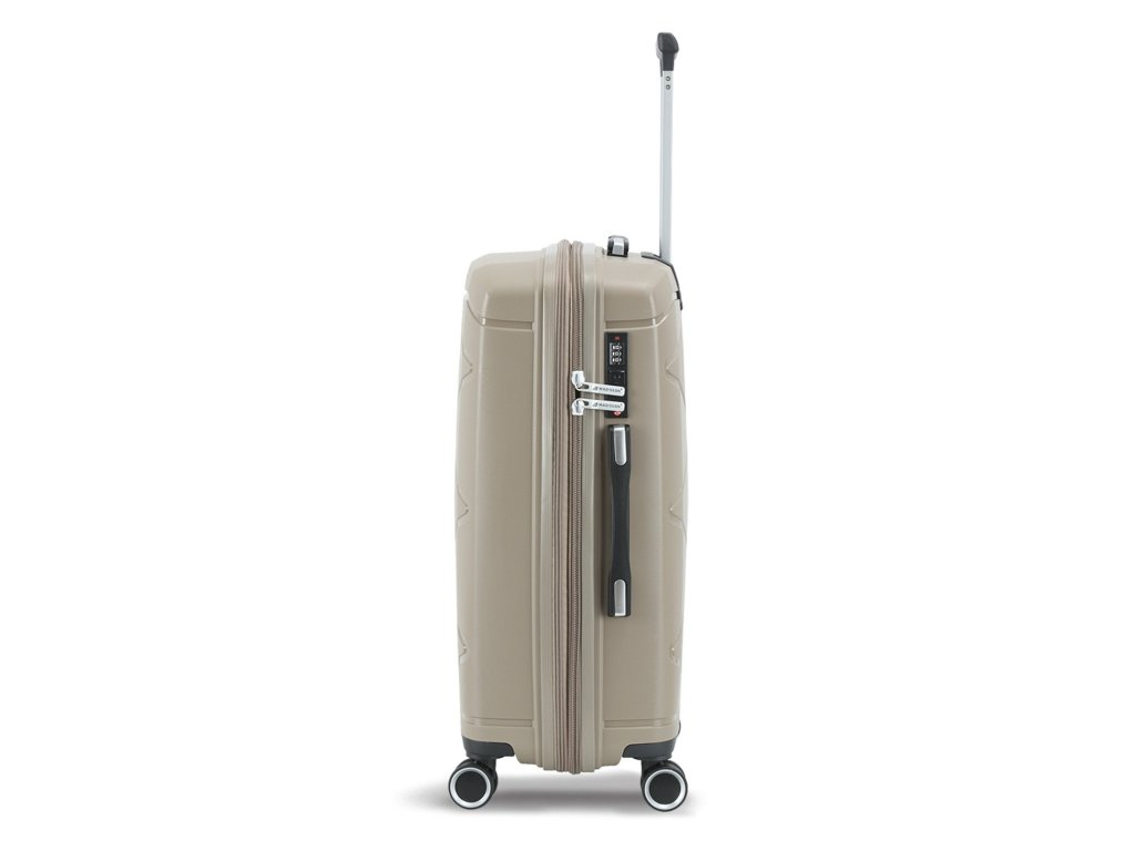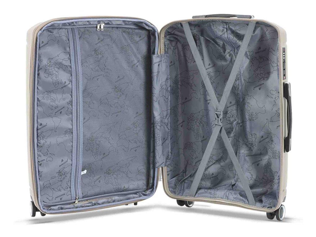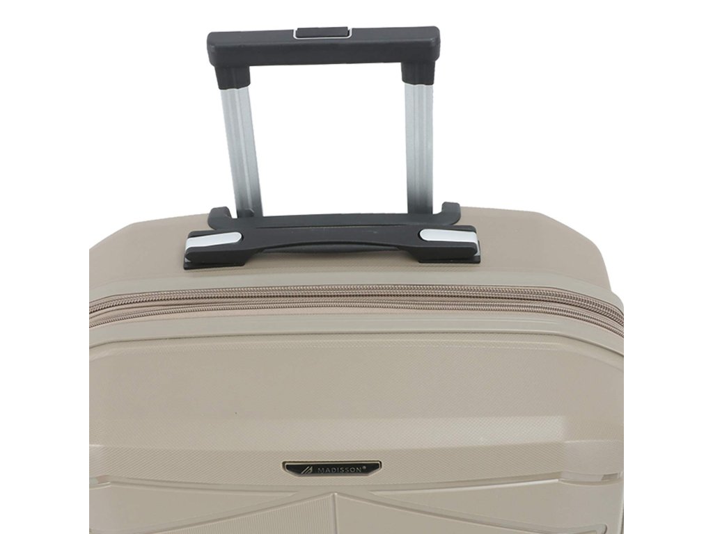 Cestovní kufr 75 cm francouzské značky Madisson v šampaňské barvě. Polypropylenový kufr Madisson nabízí hned řadu výhod, a to nízkou hmotnost, téměř nulovou rozbitnost, cenovou dostupnost pro každého, solidní zpracování a v neposlední řadě také elegantní a moderní drážkovaný vzhled.