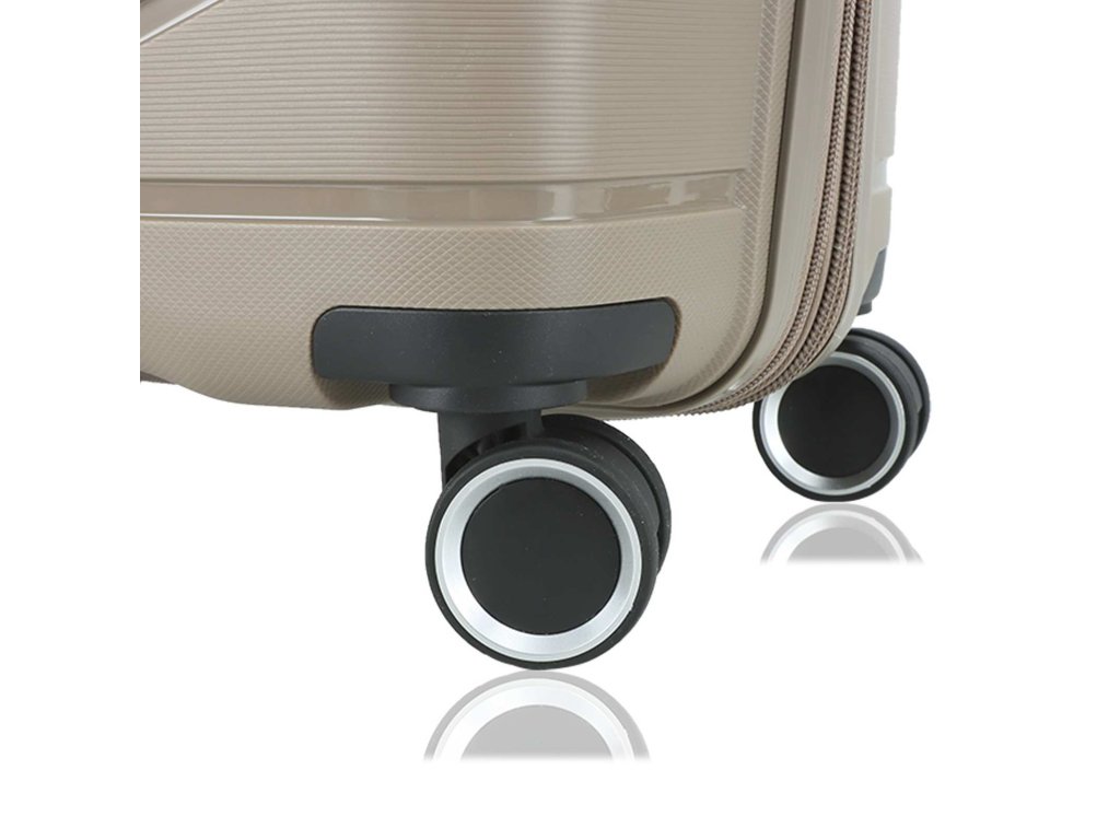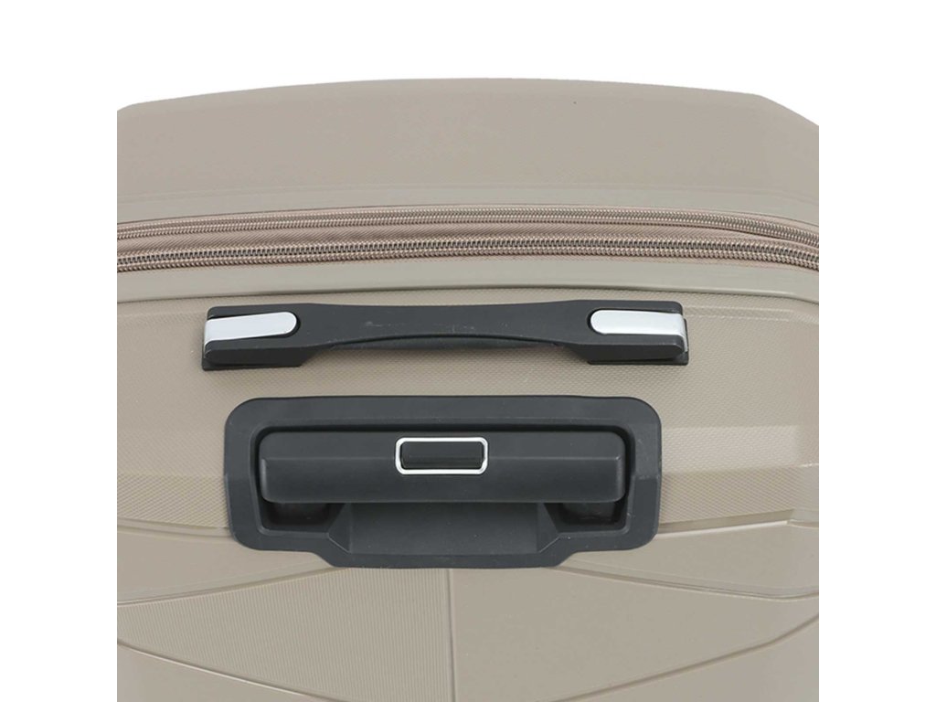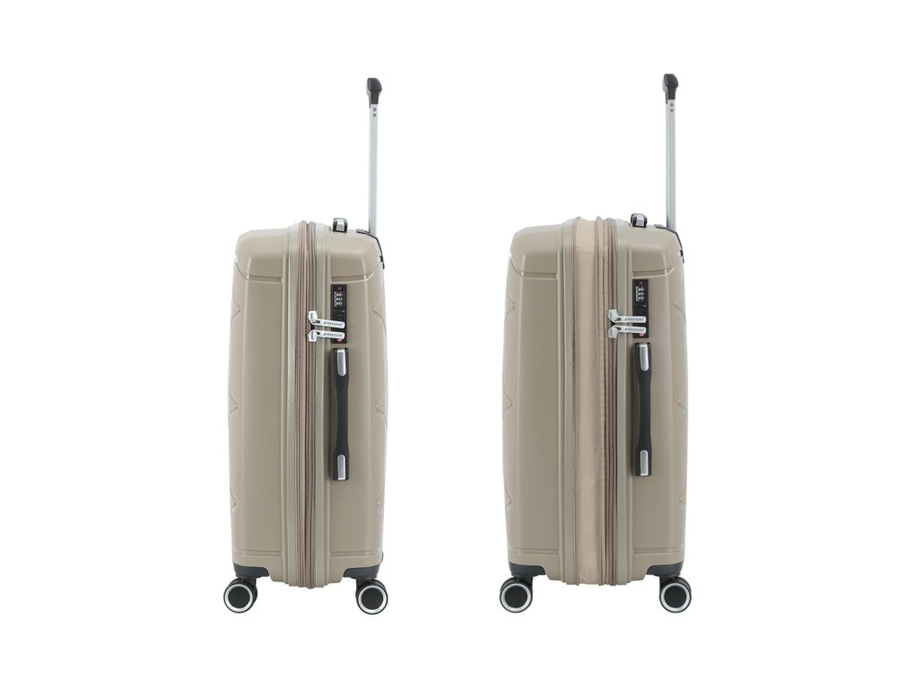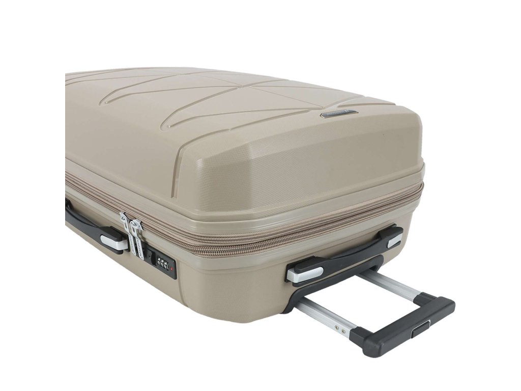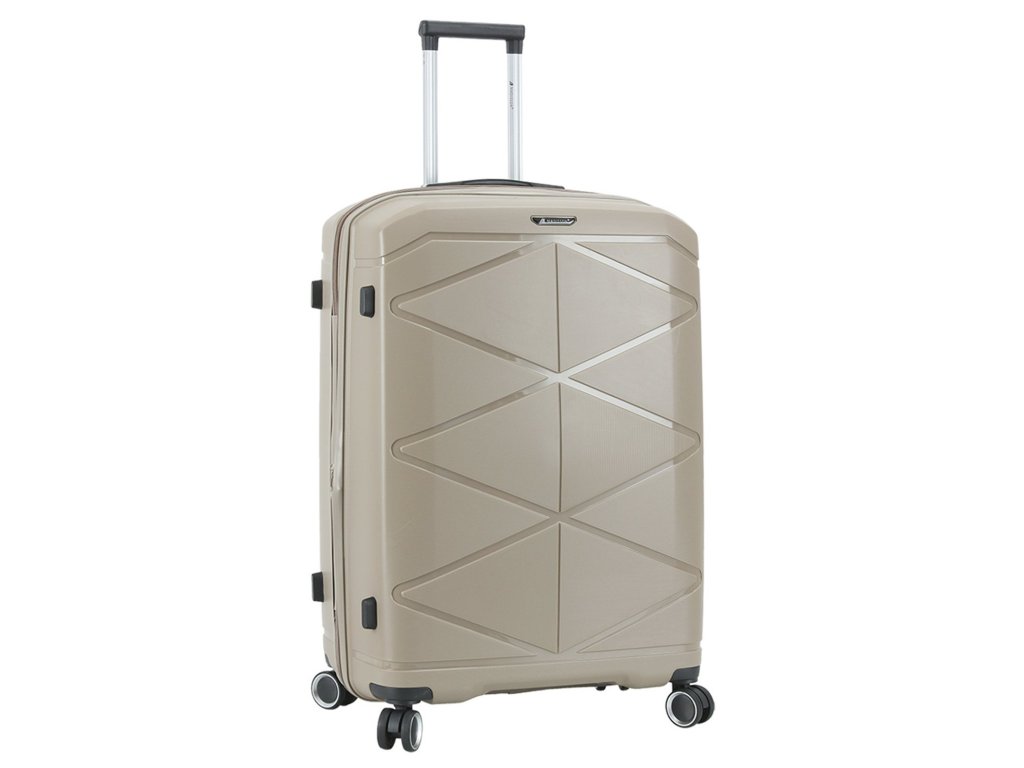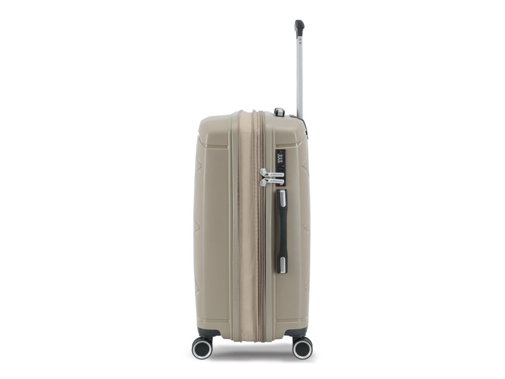 Cestovní kufr 75 cm francouzské značky Madisson v šampaňské barvě. Polypropylenový kufr Madisson nabízí hned řadu výhod, a to nízkou hmotnost, téměř nulovou rozbitnost, cenovou dostupnost pro každého, solidní zpracování a v neposlední řadě také elegantní a moderní drážkovaný vzhled.