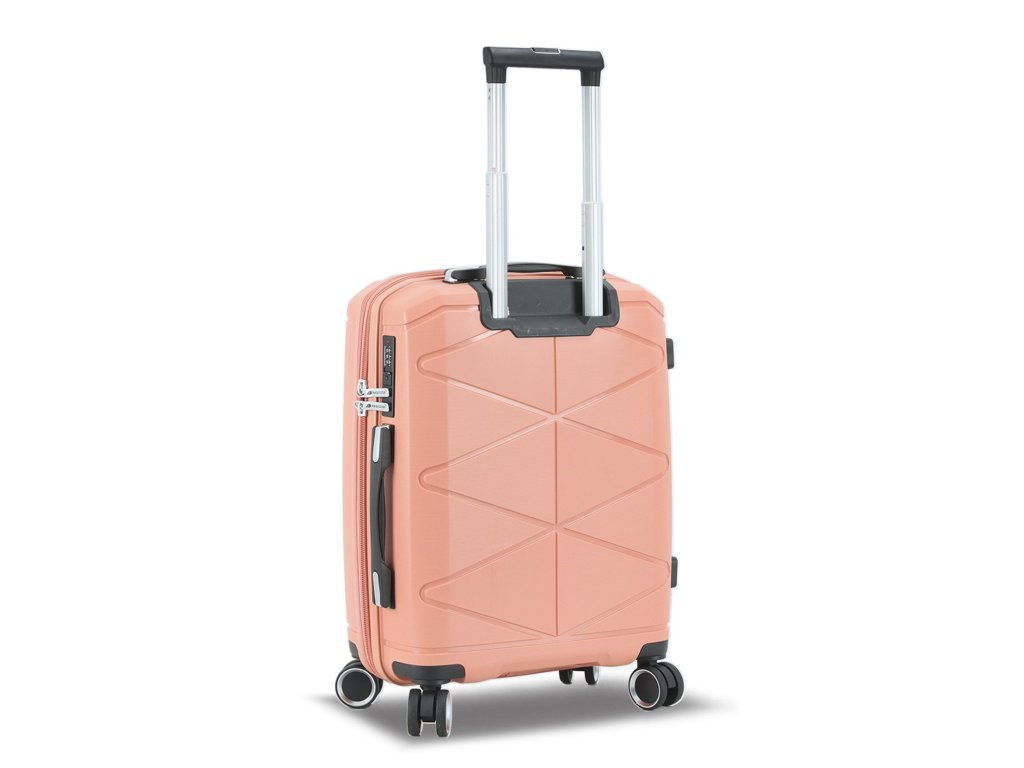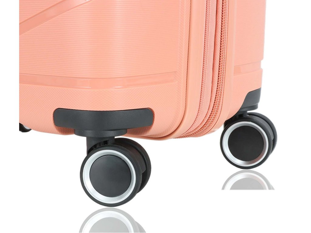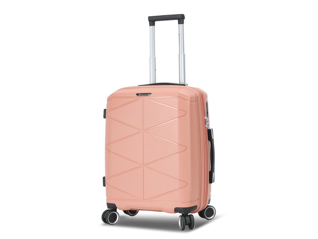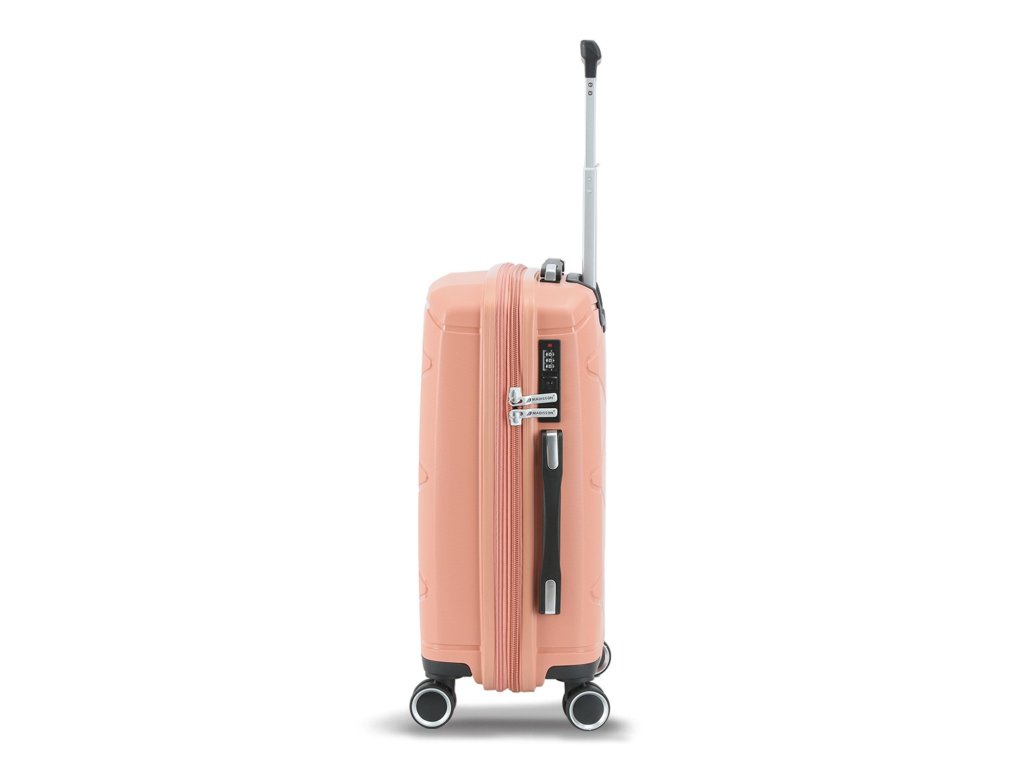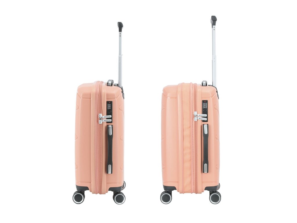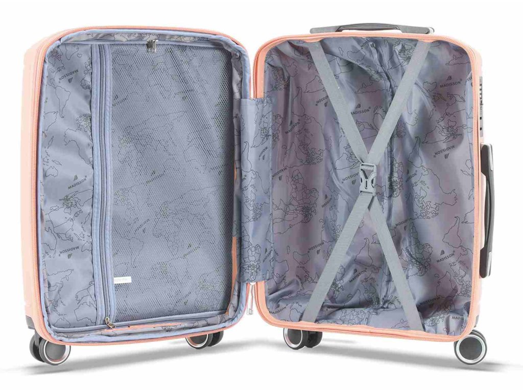 Cestovní kufr velikosti S francouzské značky Madisson ve zlato růžové barvě. Polypropylenový kufr Madisson nabízí hned řadu výhod, a to nízkou hmotnost, téměř nulovou rozbitnost, cenovou dostupnost pro každého, solidní zpracování a v neposlední řadě také elegantní a moderní drážkovaný vzhled.