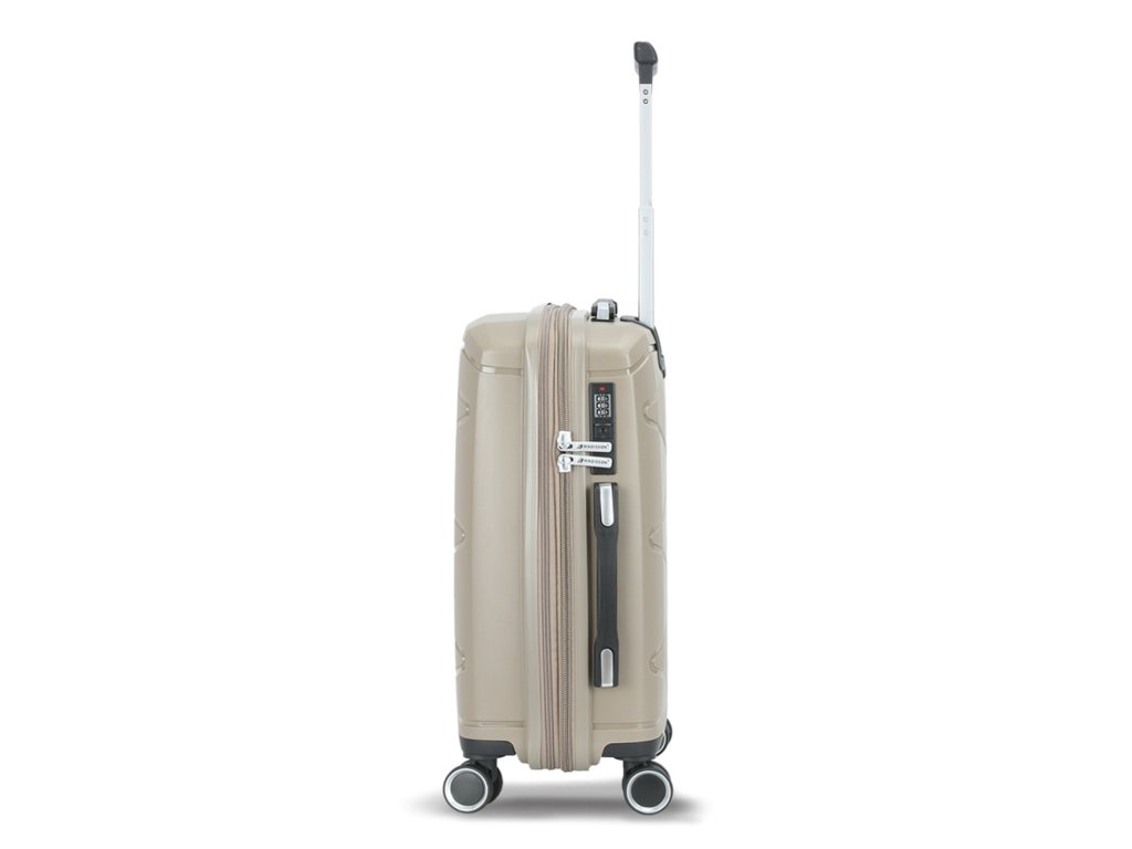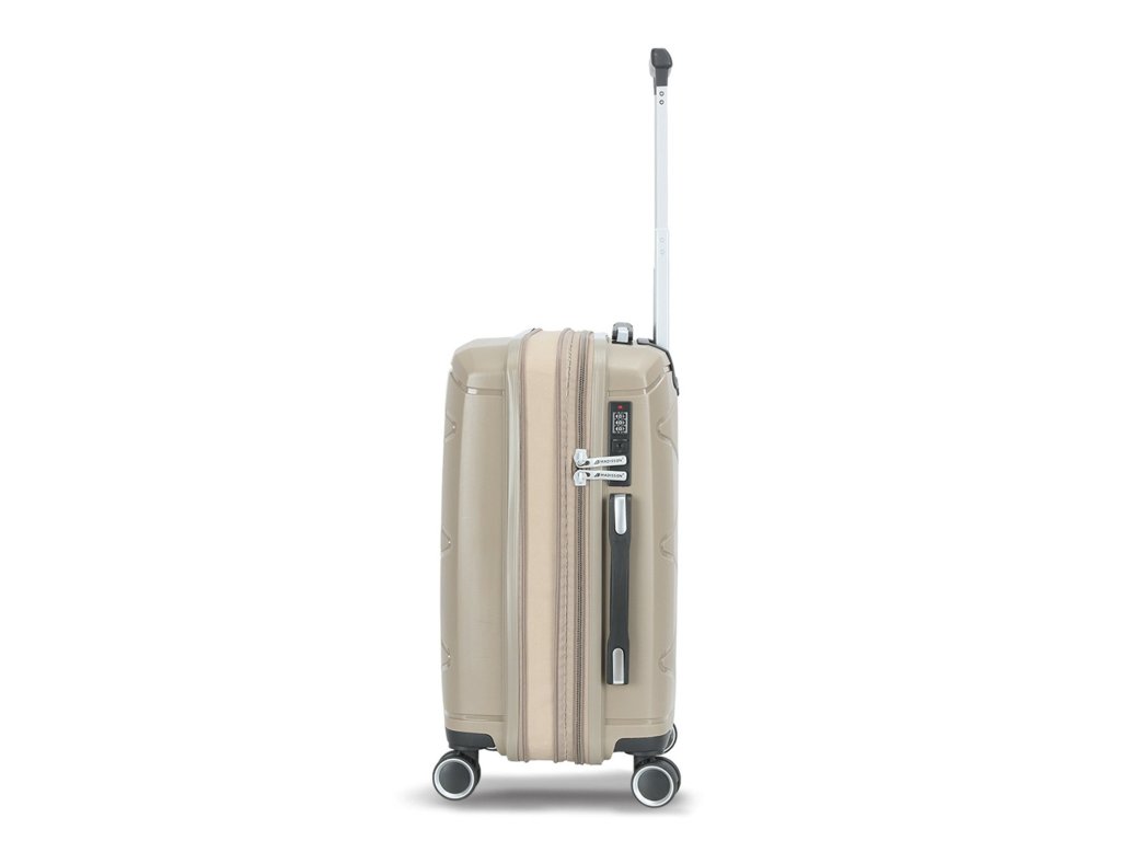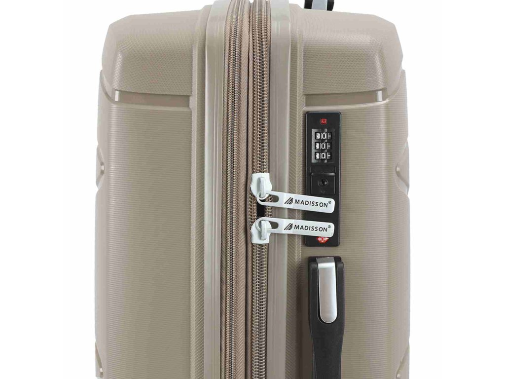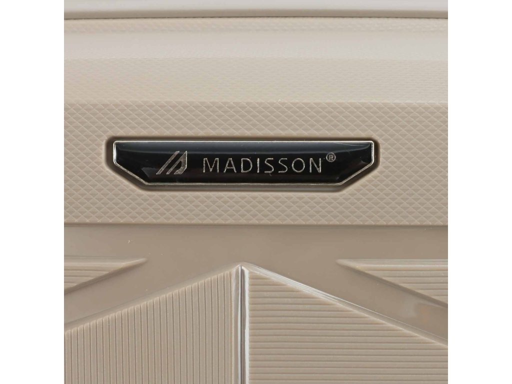 Cestovní kufr velikosti S francouzské značky Madisson v šampaňské barvě. Polypropylenový kufr Madisson nabízí hned řadu výhod, a to nízkou hmotnost, téměř nulovou rozbitnost, cenovou dostupnost pro každého, solidní zpracování a v neposlední řadě také elegantní a moderní drážkovaný vzhled.