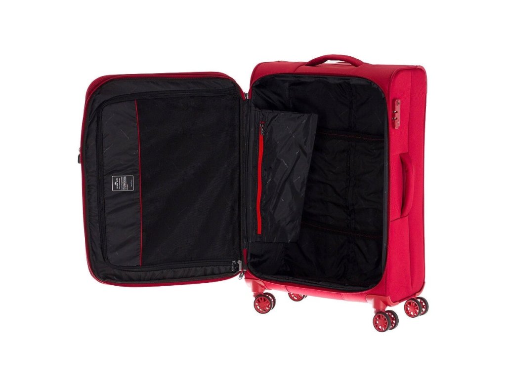 Moderní ultralehký cestovní textilní kufr 68 cm holandské značky march ze série easy v červené barvě.- 4 dvoukolečka otočná o 360 stupňů.