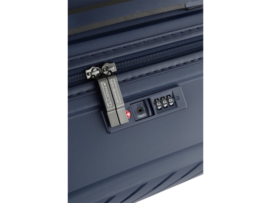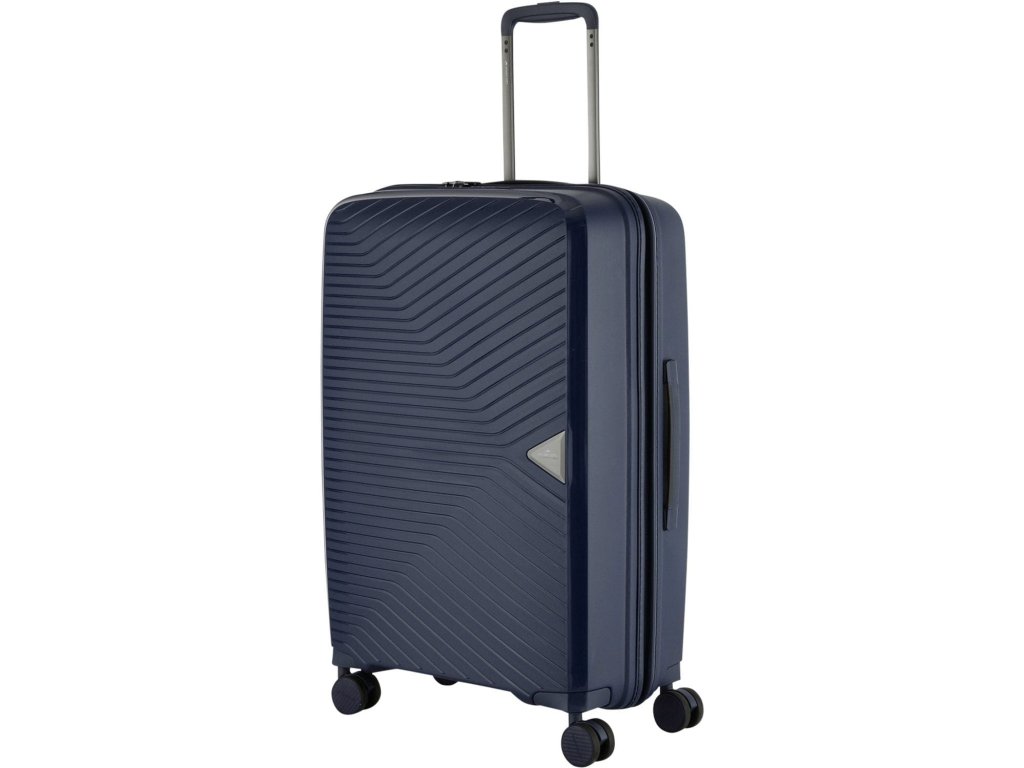 čistě elegantní plastový kufr 67 cm holandské značky march v tmavší modré barvě linie gotthard s prolisy proužky.