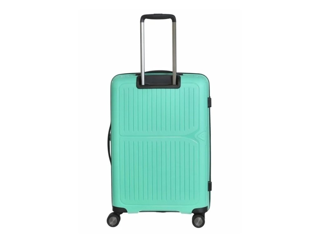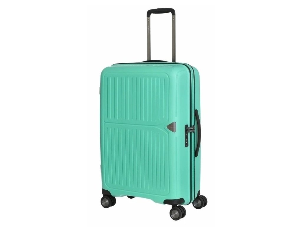 Čistě elegantní plastový kufr 66 cm holandské značky march v tyrkysové barvě linie Ready to go s prolisy proužky.