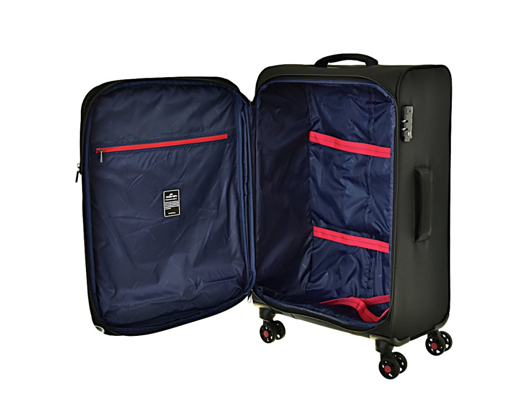 Cestovní textilní velký kufr z extrémně lehkého materiálu holandské značky March v oblíbené černé barvě s červenými detaily. Nová technologie odlehčeného materiálu Vám přinese maximální pohodlí na cestách. Vydejte se stylově na cesty s novou řadou Tourer.