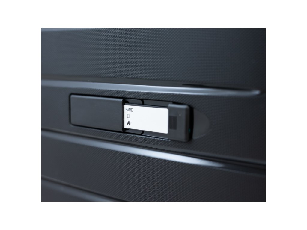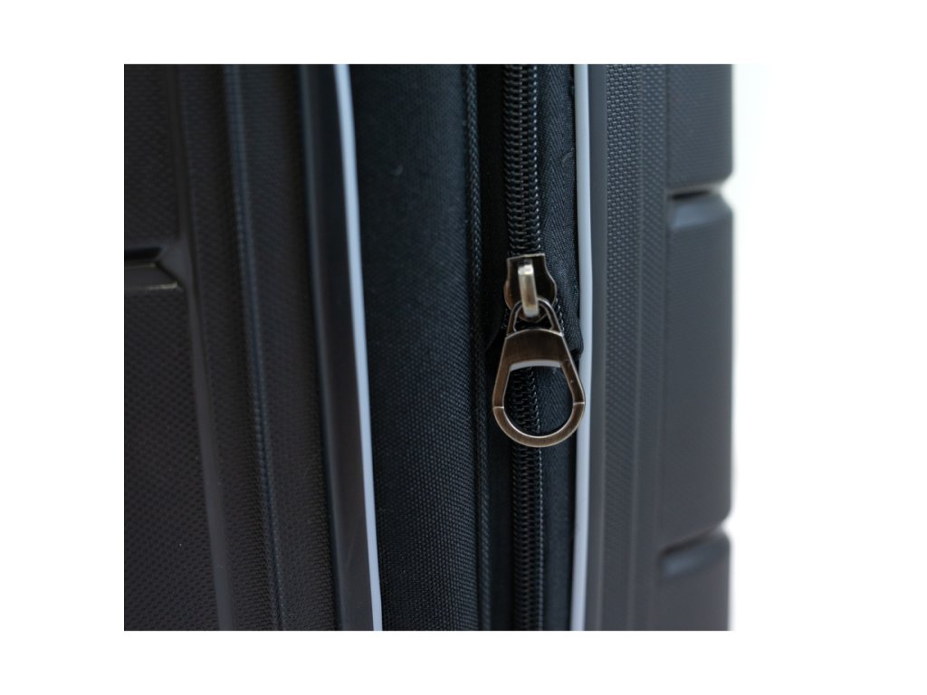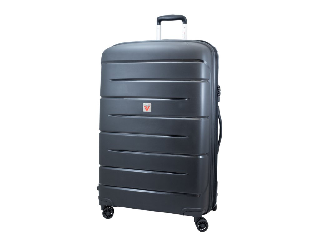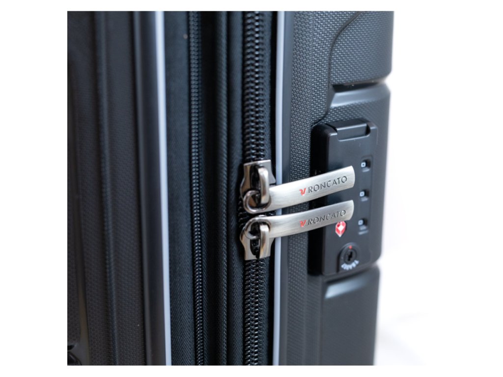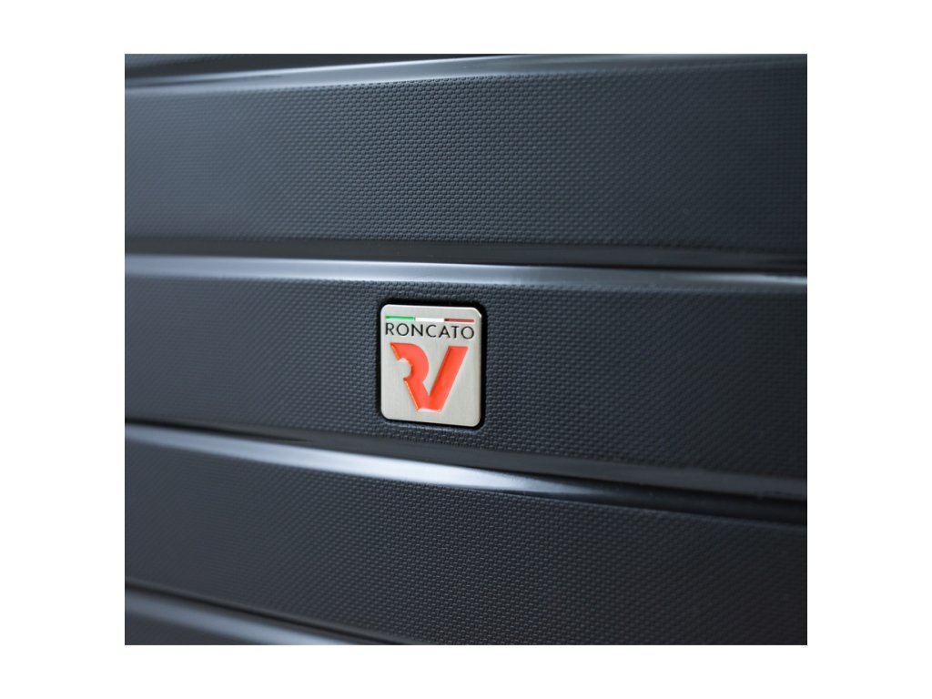 Cestovní skořepinový kufr italské značky Roncato v oblíbené černé barvě. Povrch kufru je rezistentní proti vodě a díky technologii high schock také vůči nárazu. Polypropylen je lehký a pružný materiál.