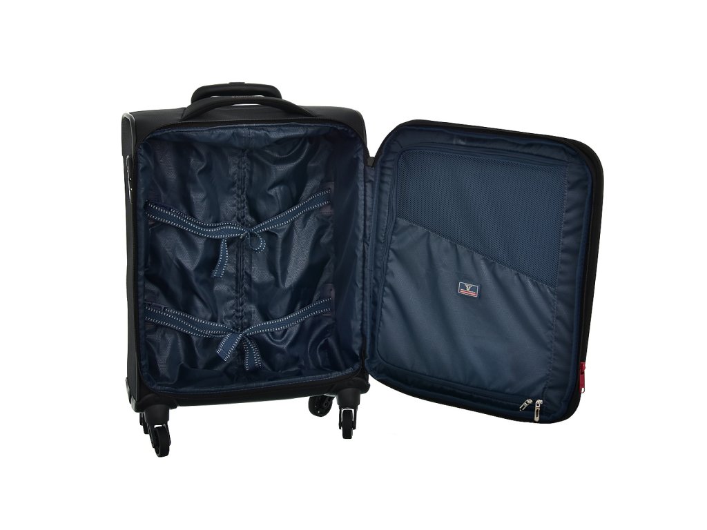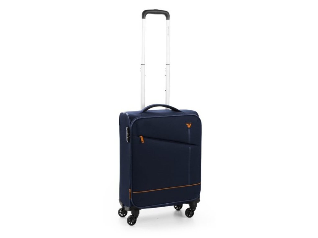 Textilní palubní cestovní kufr italské značky Roncato v oblíbené modré barvě s oranžovými detaily. Kufry jsou šité z vysoce kvalitního materiálu nylon, který je lehký a odolný, odolný vůči teplu a světlu, a také při působení ultrafialového záření.