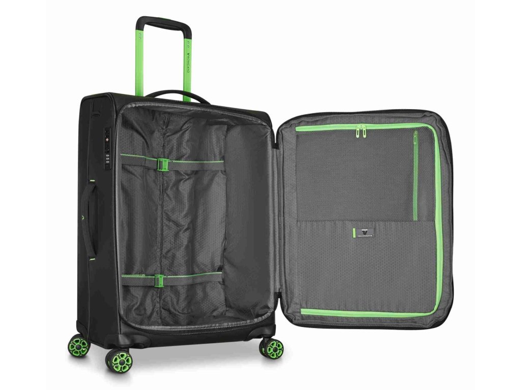 Cestovní textilní kufr 64 cm italské značky Roncato série Norway v oblíbené černé barvě se zelenými doplňky. Nová kolekce Norway je navržena pro ty, kteří milují cestování, aniž by se vzdali charakteru a funkčnosti, a spojuje městskou inspiraci s outdoorovým duchem. Norway je všestranná, mladistvá a dynamická kolekce ideální pro ty, kteří hledají flexibilitu, praktičnost a ležérní, ale zároveň rafinovaný styl – ideální pro každou cestu. Pro dynamické cestovatele mezi městem a přírodou. Ideální pro víkendové cesty, cestování letadlem, každodenní použití ve městě. Norway je kolekce vyrobená z voděodolného / vodoodpudivého materiálu se sportovním designem pro ty, kteří hledají všestrannost a odolnost na každé cestě.