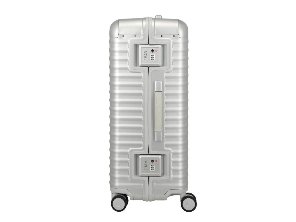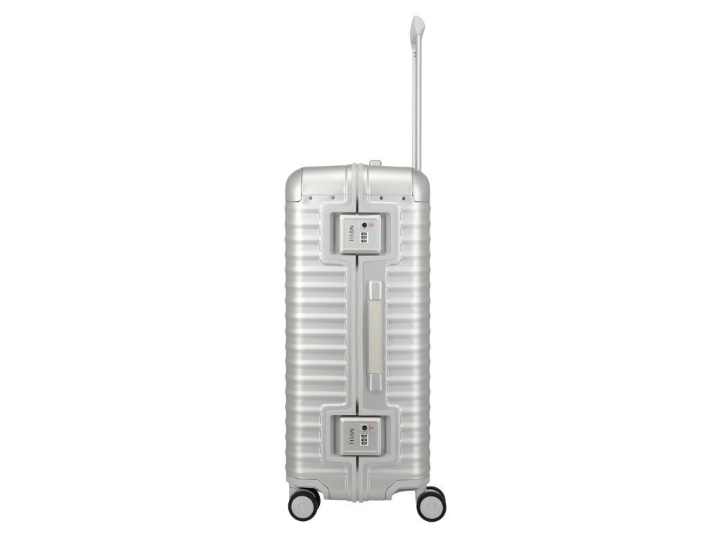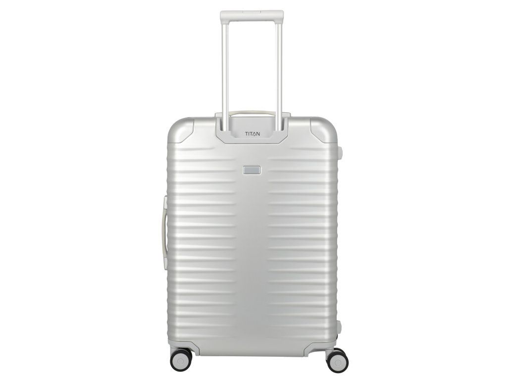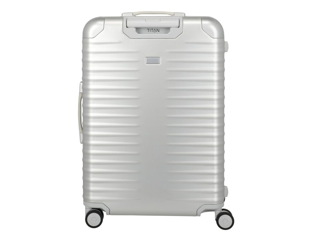 Exkluzivní skořepinový kufr 75 cm na čtyřech kolečkách s integrovaným TSA zámkem v patentovém zavírání německé značky Titan exkluzivní série ETERNITY v oblíbené stříbrné barvě. TITAN ETERNITY: první hliníkový kufr na světě s polymerovým rámem. Tato jedinečná kombinace tlumí nárazy a minimalizuje promáčknutí. Zde se exkluzivita potkává s inovací. Kufr je vybaven kvalitními koženými madly, prvotřídními kolečky s kuličkovými ložisky a plynule nastavitelnou teleskopickou rukojetí. Hliníkový kufr TITAN Eternity kombinuje inovativní technologii s nadčasovou elegancí. Design stvořený, aby vydržel věčnost.