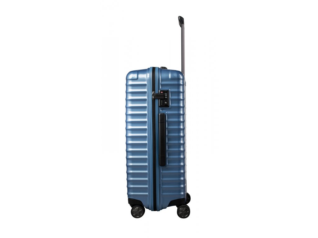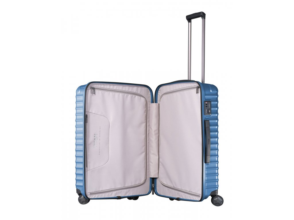 Luxusní skořepinový kufr na čtyřech kolečkách s integrovaným TSA zámkem německé značky Titan prémiové série LITRON v modré barvě. Kufr je vyroben z polykarbonátu, který je lehký, pevný a přitom pružný, díky tomu vydrží i značnou zátěž. Užijte si cestování s tímto špičkovým kufrem, který potěší i náročnější zákazníky.