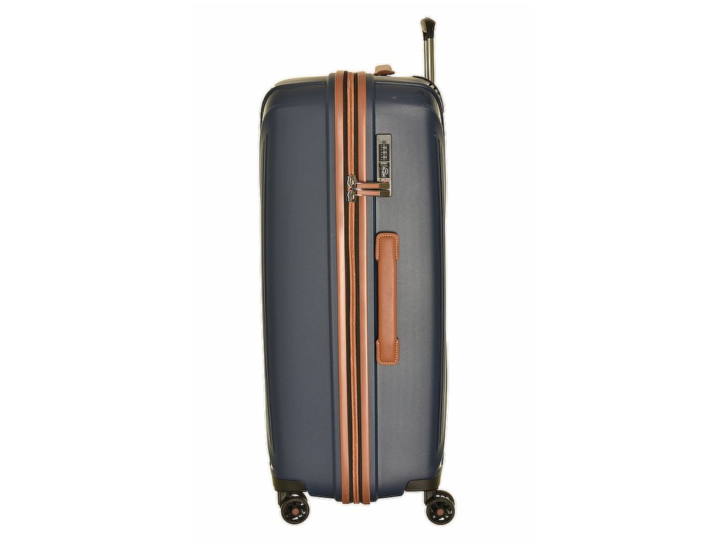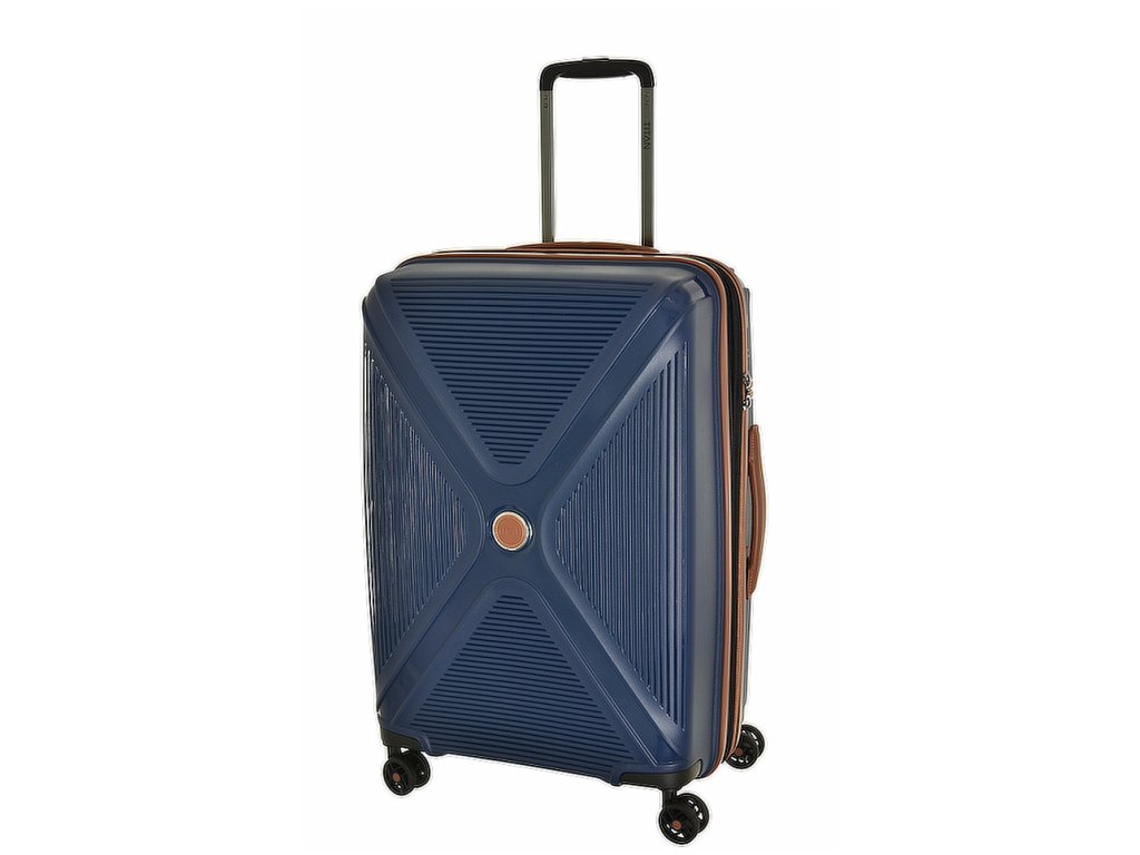 Designový polypropylenový cestovní kufr německé značky titan 68 cm série paradoxx v modré barvě s doplňky v hnědé barvě.- Výsuvná rukojeť s aretací polohy.