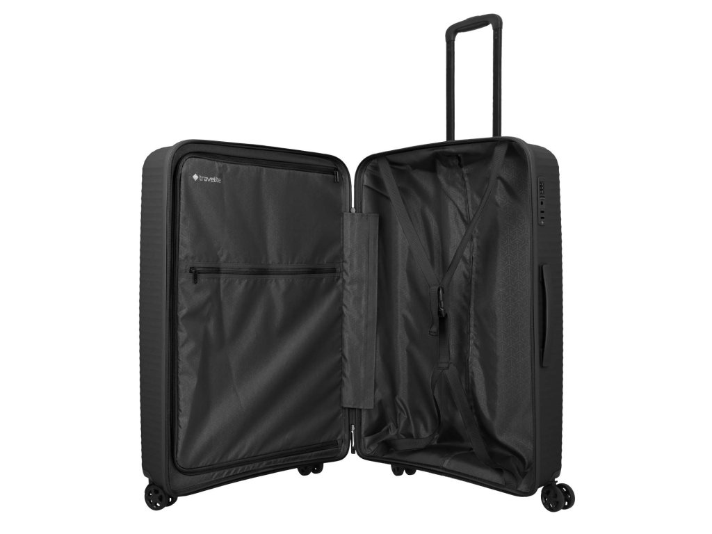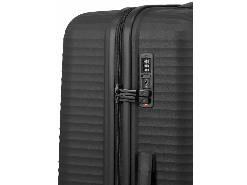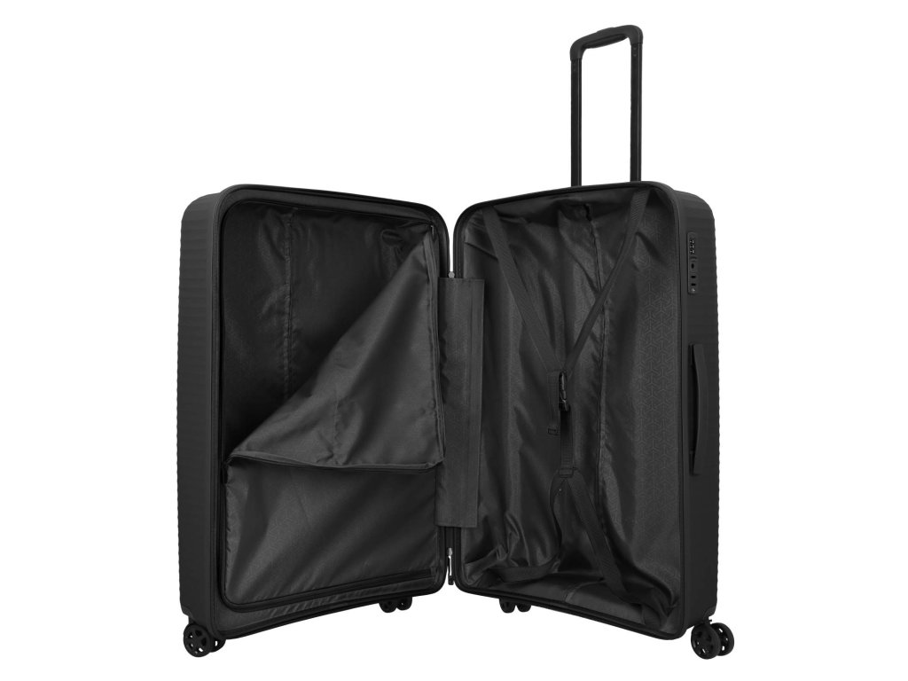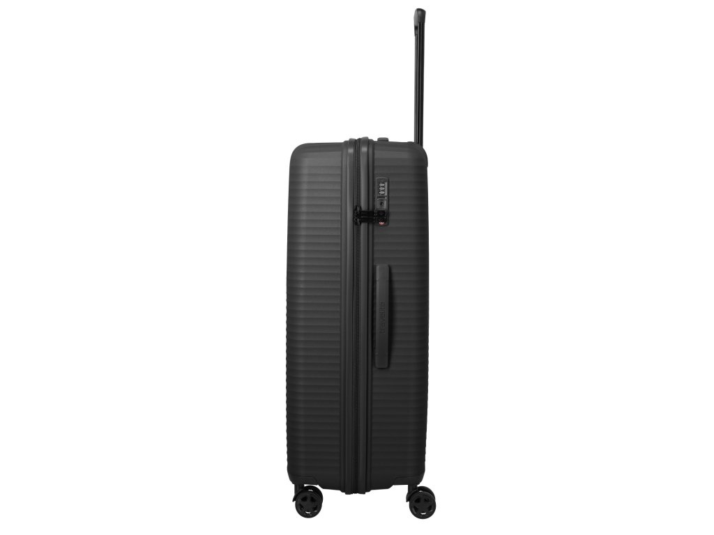 Skořepinový ultralehký cestovní kufr velikosti L značky Travelite série Air stripe v oblíbené černé barvě. Protože velká dobrodružství potřebují prostor.