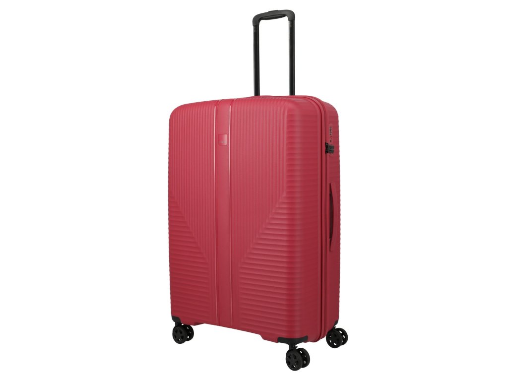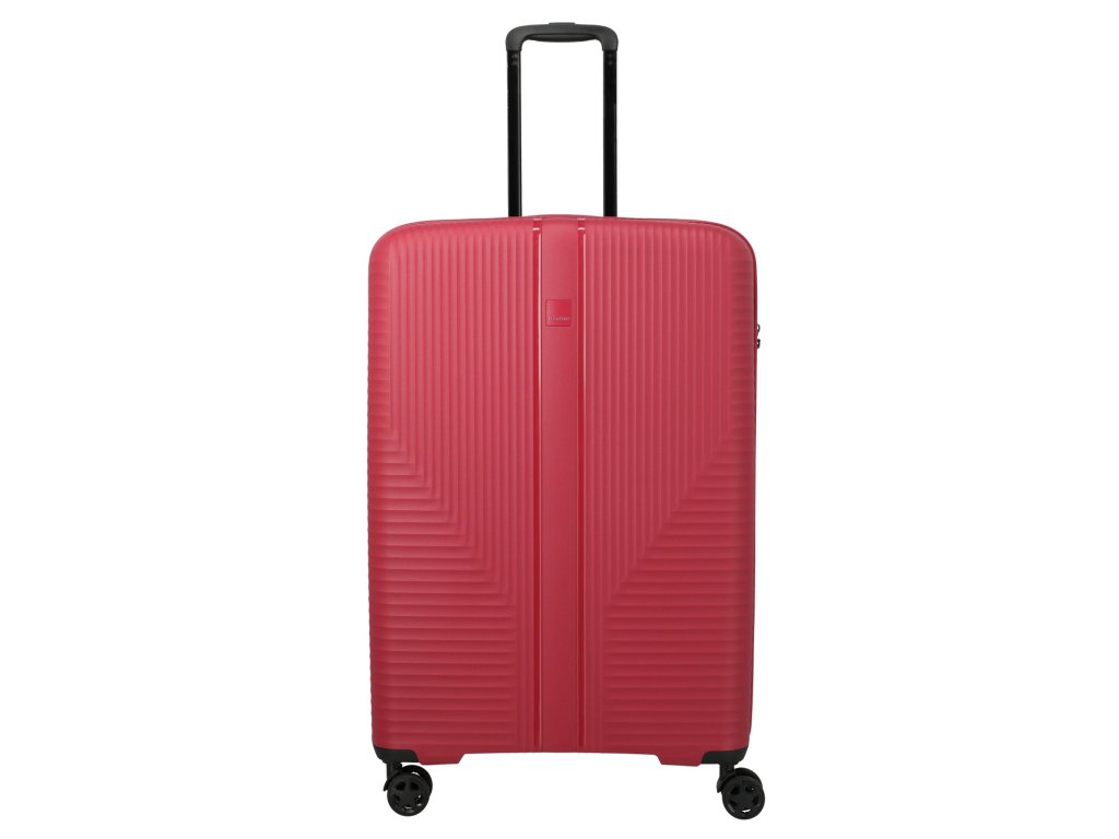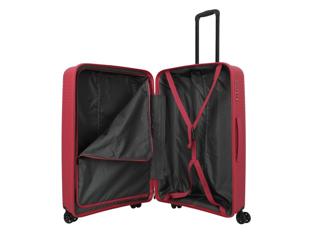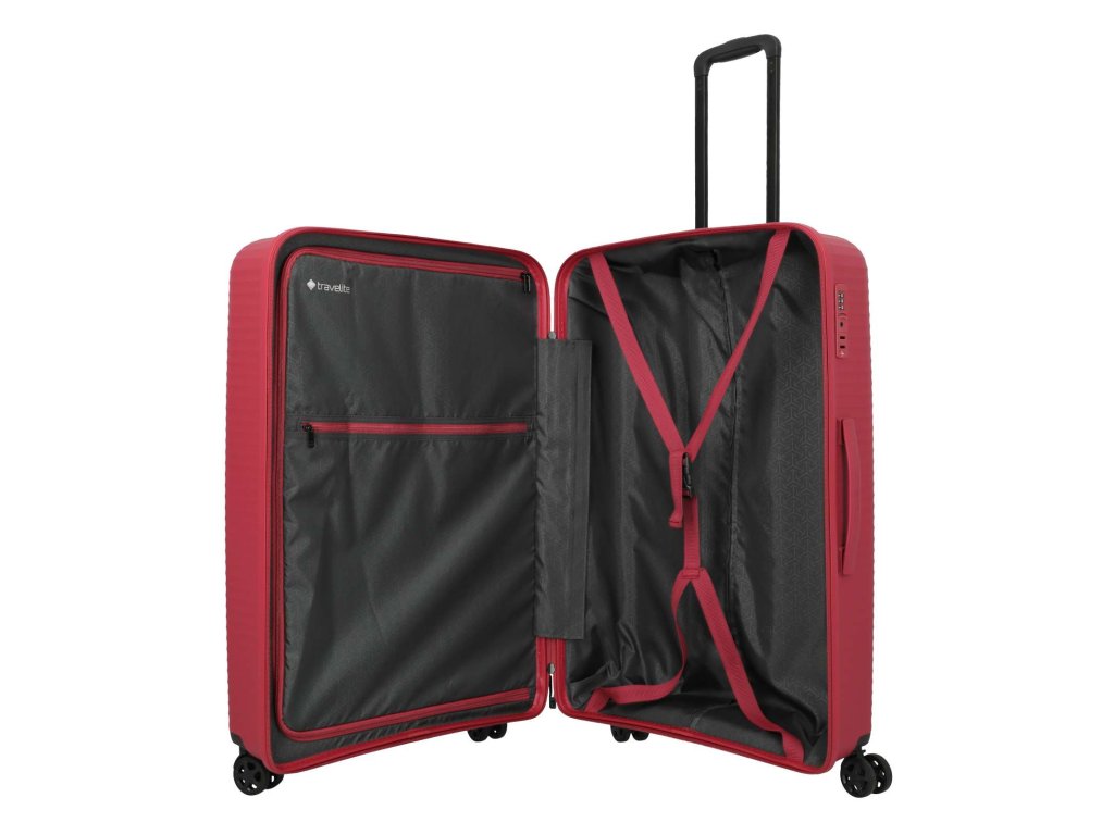 Skořepinový ultralehký cestovní kufr velikosti L značky Travelite série Air stripe v červené barvě. Protože velká dobrodružství potřebují prostor.