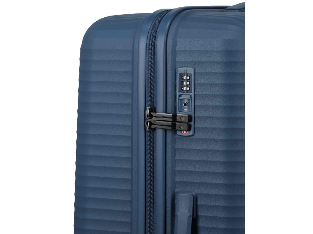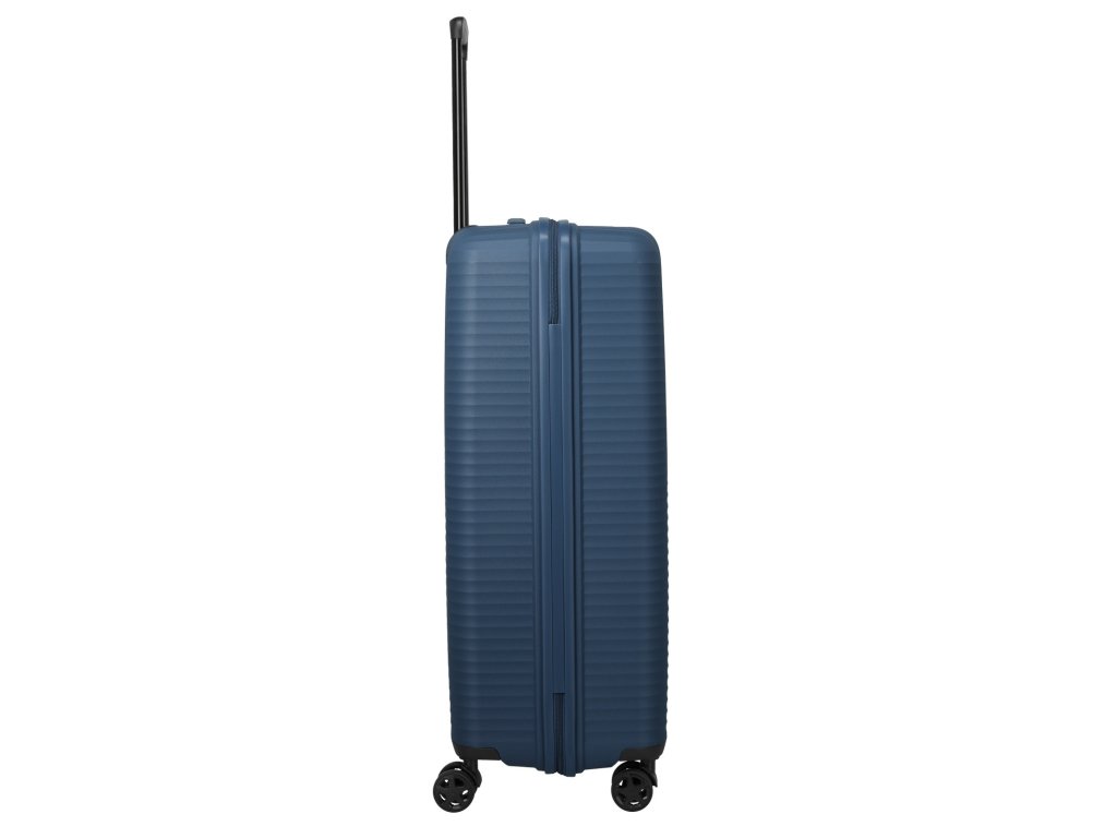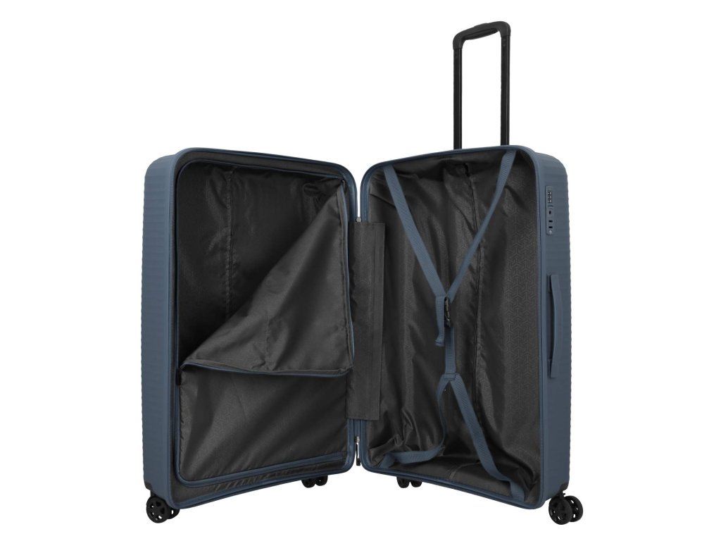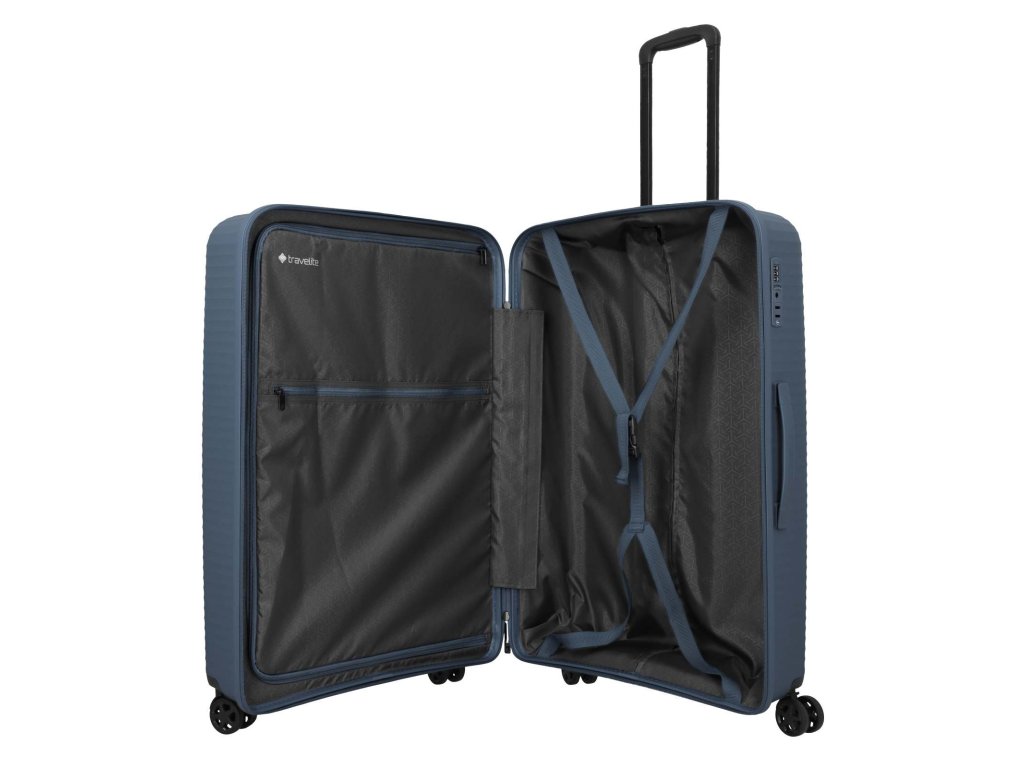 Skořepinový ultralehký cestovní kufr velikosti L značky Travelite série Air stripe v tmavě modré barvě. Protože velká dobrodružství potřebují prostor.