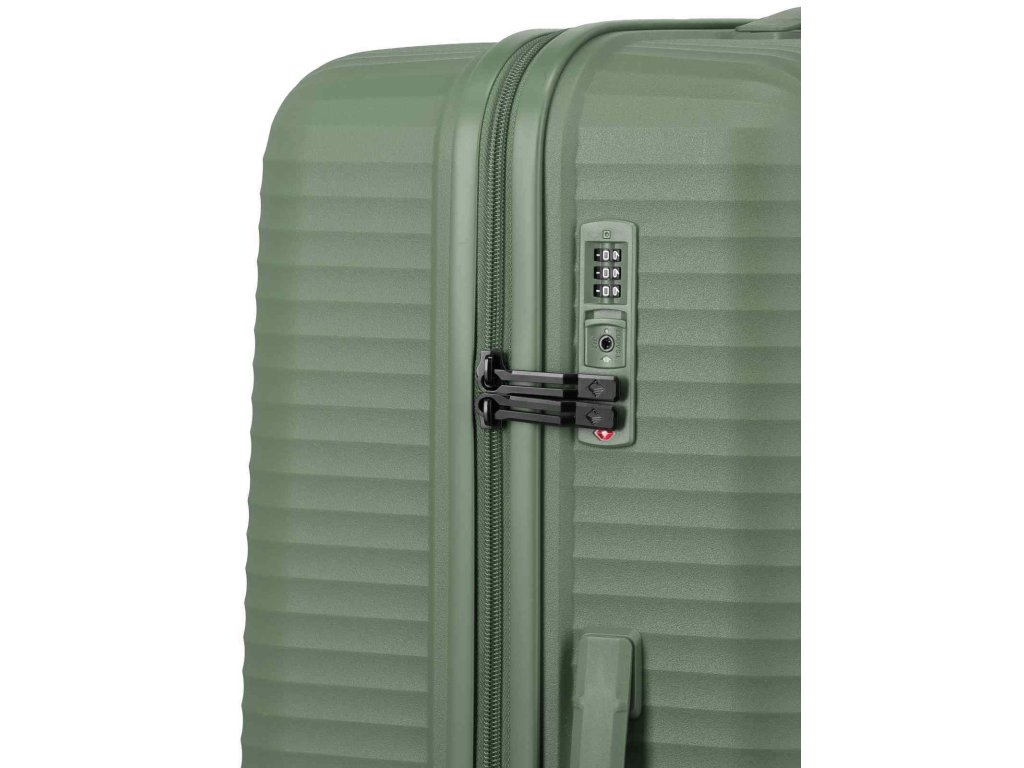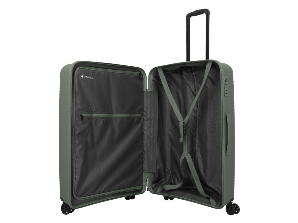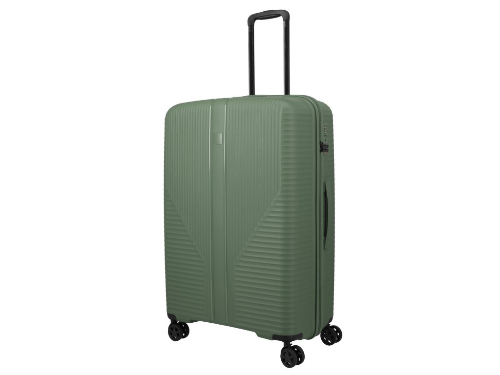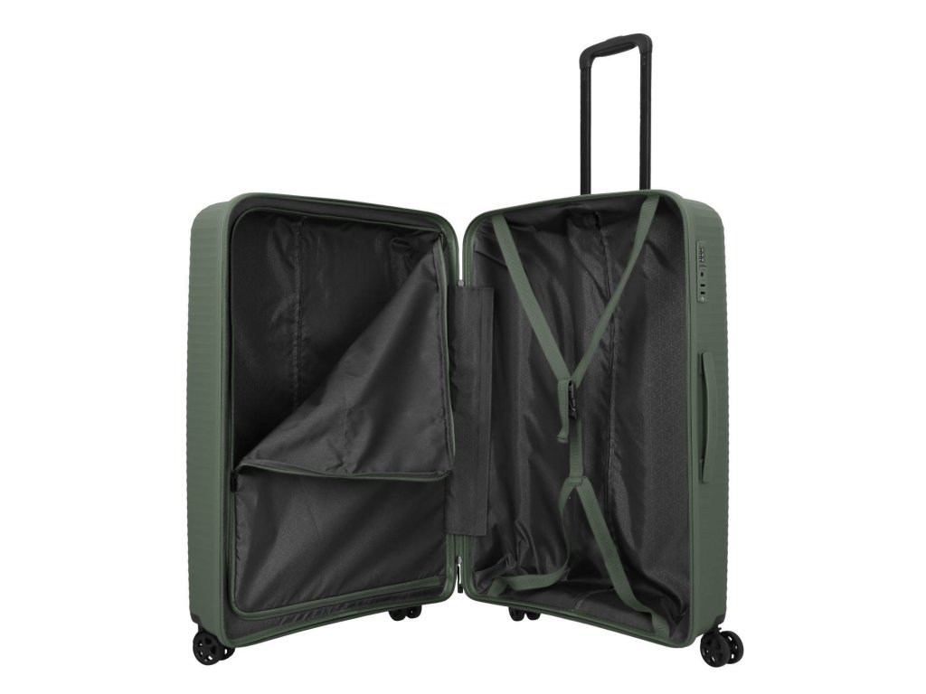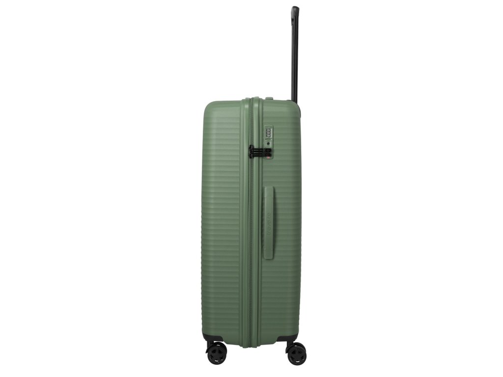 Skořepinový ultralehký cestovní kufr velikosti L značky Travelite série Air stripe v zelené barvě. Protože velká dobrodružství potřebují prostor.