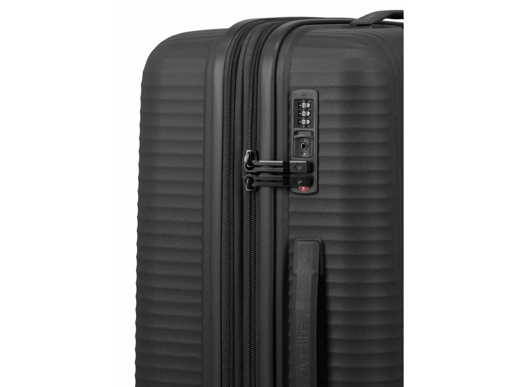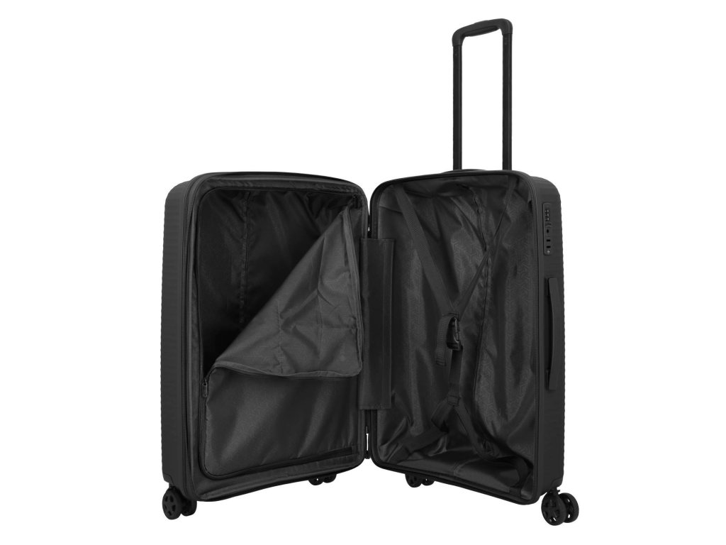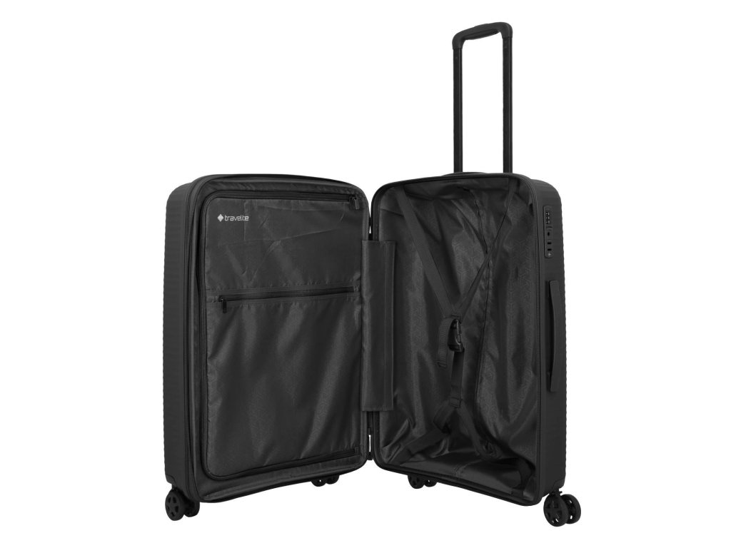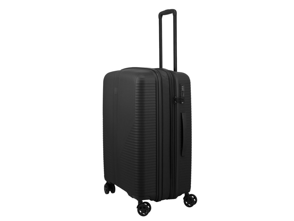 Skořepinový ultralehký cestovní kufr velikosti M značky Travelite série Air stripe v oblíbené černé barvě. Více prostoru, více možností. Odlet: všechno se vejde perfektně. Návrat: suvenýry, nové úlovky z nákupů – a najednou je kufr malý. Ne tak s modelem Air Stripe M! Díky chytrému rozšíření se jednoduše přizpůsobí vašim potřebám. Je super lehký, ale zároveň odolný – zvládne opravdu hodně. Čtyři dvojitá kolečka zajišťují hladký pohyb, zatímco vnitřní přepážky a popruhy udrží vaše věci pěkně na svém místě.