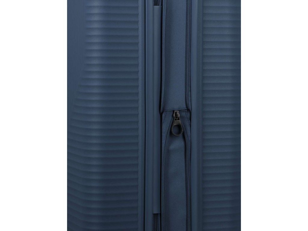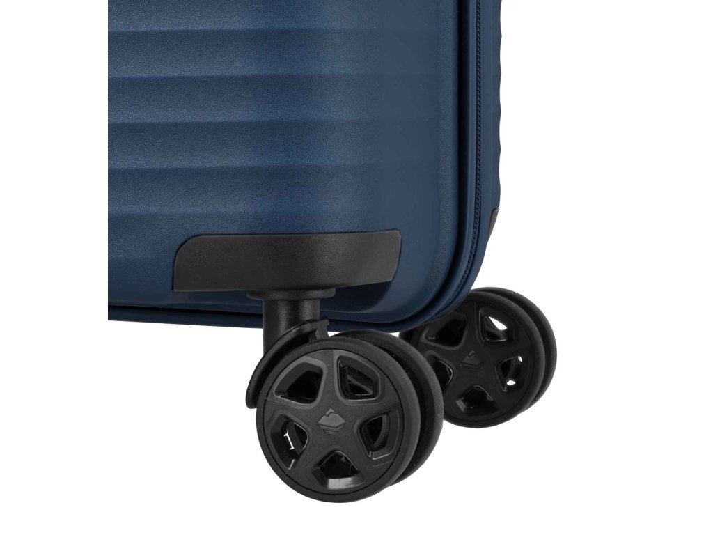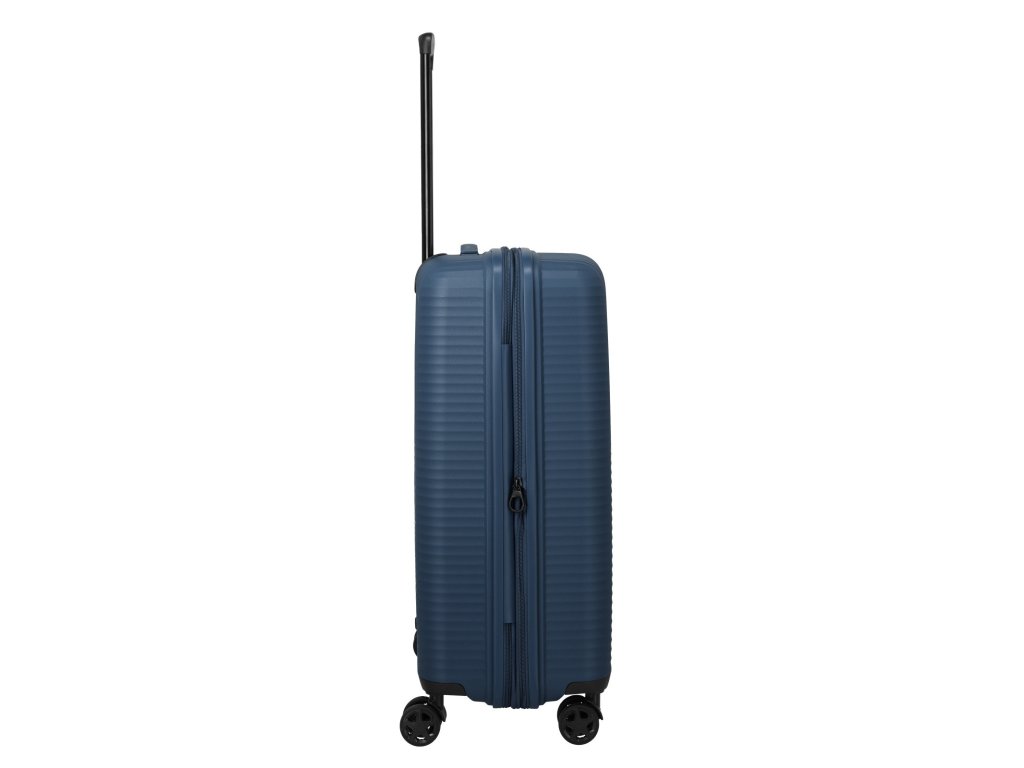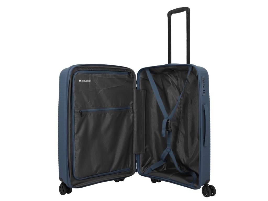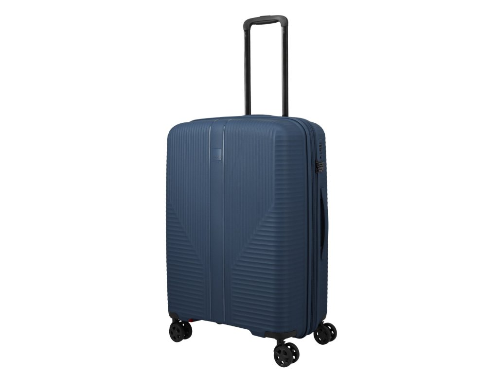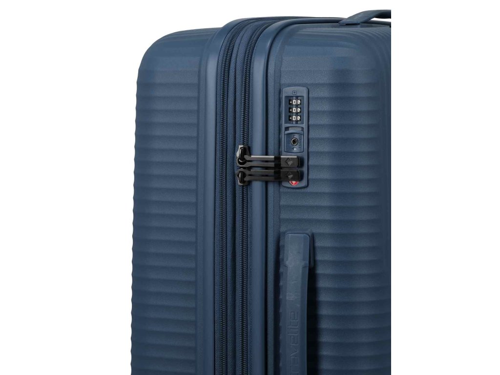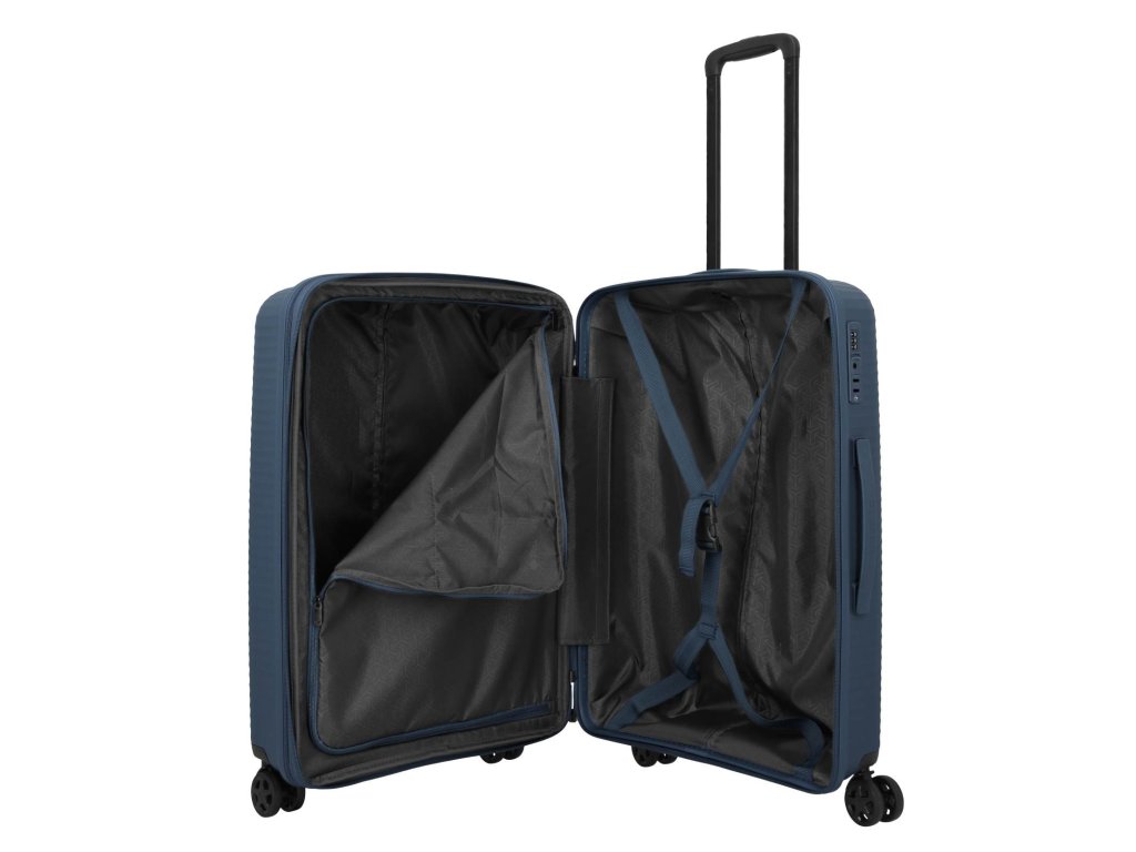 Skořepinový ultralehký cestovní kufr velikosti M značky Travelite série Air stripe v tmavě modré barvě. Více prostoru, více možností. Odlet: všechno se vejde perfektně. Návrat: suvenýry, nové úlovky z nákupů – a najednou je kufr malý. Ne tak s modelem Air Stripe M! Díky chytrému rozšíření se jednoduše přizpůsobí vašim potřebám. Je super lehký, ale zároveň odolný – zvládne opravdu hodně. Čtyři dvojitá kolečka zajišťují hladký pohyb, zatímco vnitřní přepážky a popruhy udrží vaše věci pěkně na svém místě.
