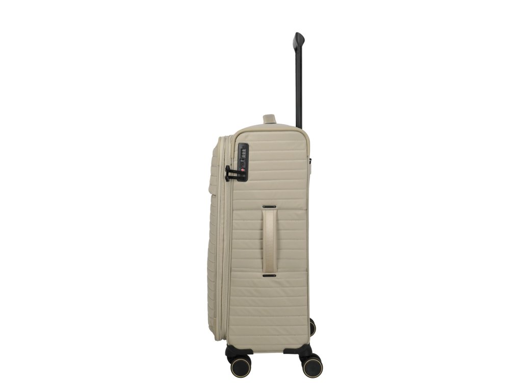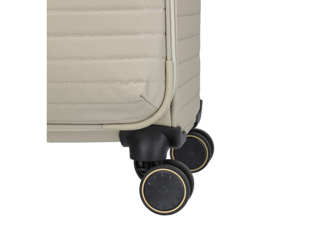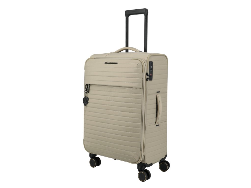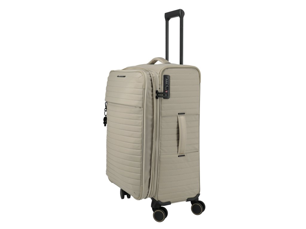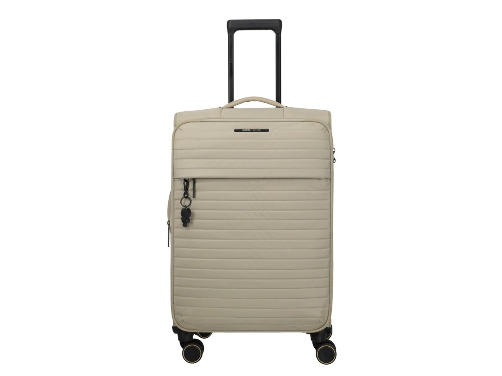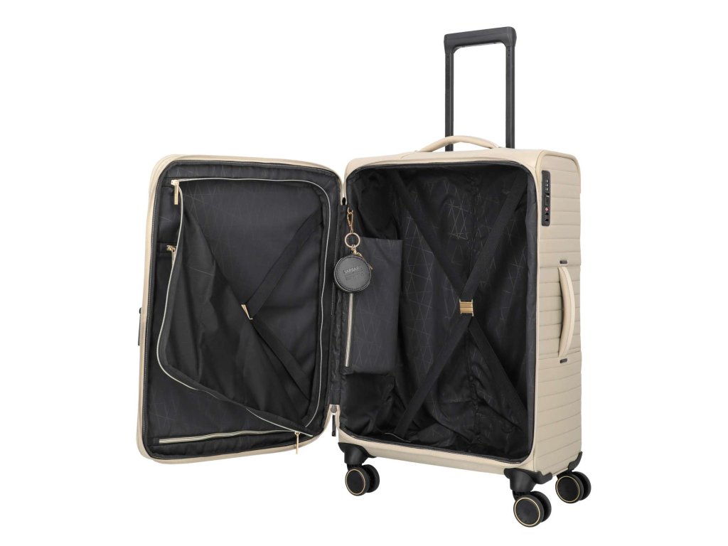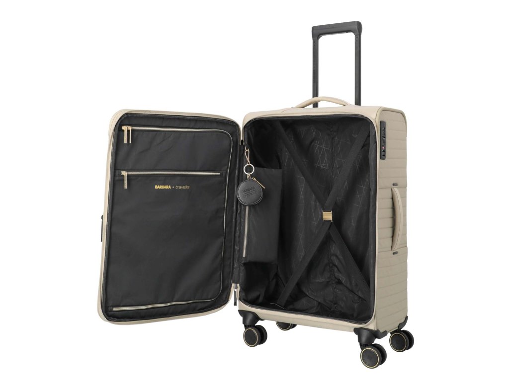 Textilní kvalitní kufr německé značky Travelite 68 cm v zajímavé pískové barvě série Barbara Stepp. Kufr velikosti M z kolekce Stepp od BARBARA & travelite zaujme elegantním vzhledem z recyklovaného nylonu, zlatými kovovými detaily a integrovaným TSA zámkem – pro bezpečné a stylové cestování. Uvnitř nabízí zipové kapsy, samostatný vak na boty či prádlo a vyjímatelnou šperkovnici. Díky rozšiřitelnému provedení se flexibilně přizpůsobí každé cestě – ať jste zrovna v centru pozornosti, nebo si jen užíváte klid.