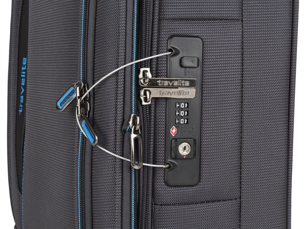- Kombinační zámek tsa na straně kufru s vytahovacím lankem pro uzamčení přední kapsy.