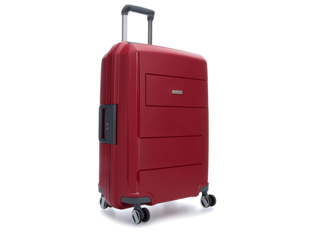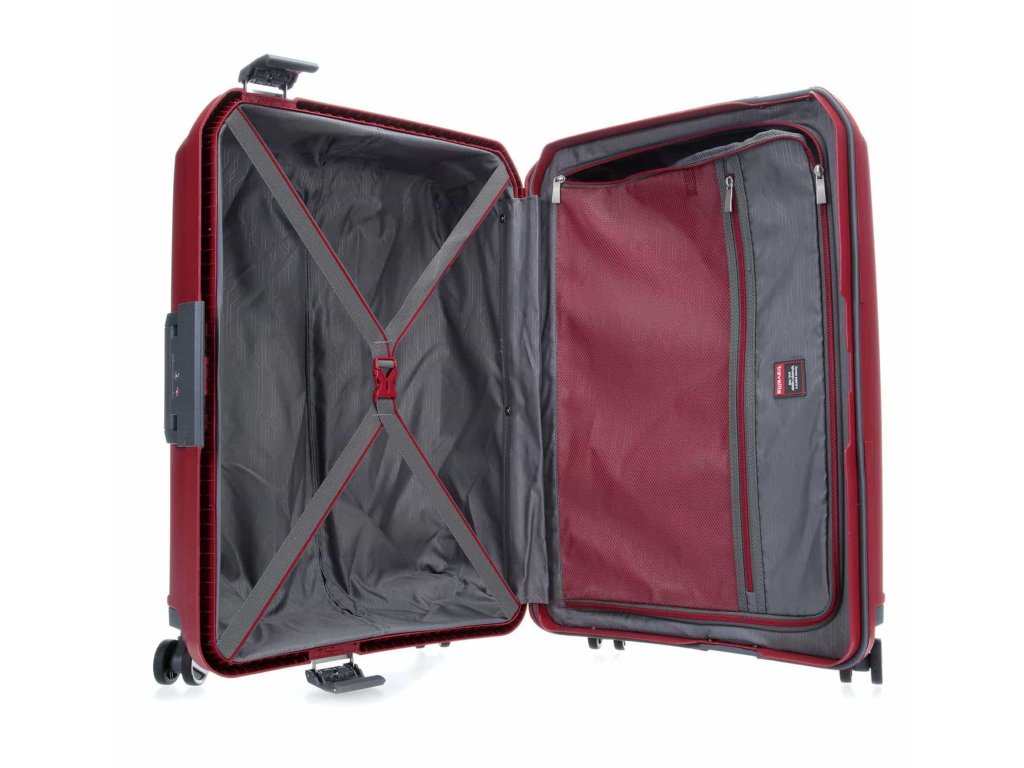 Moderní plastový kufr na kolečkách 66 cm německé značky travelite série makro v červené barvě.