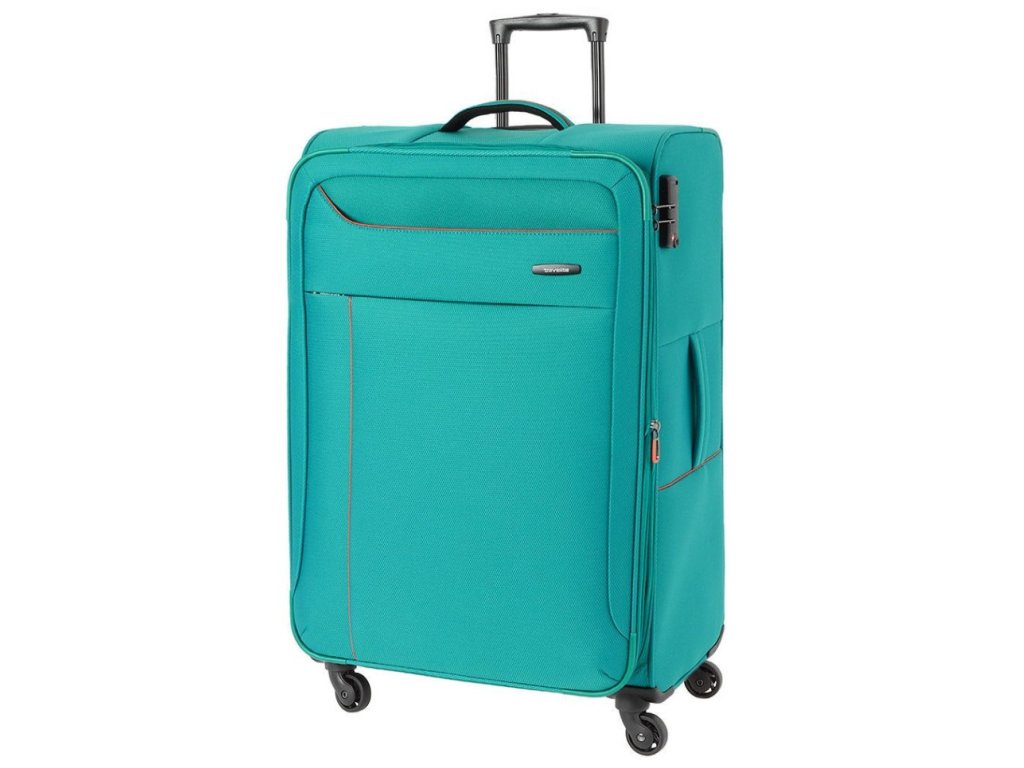 Všestranný textilní kufr německé značky travelite 77 cm linie solaris v modro zelené barvě s oranžovou.