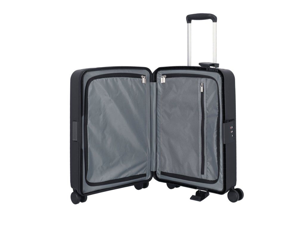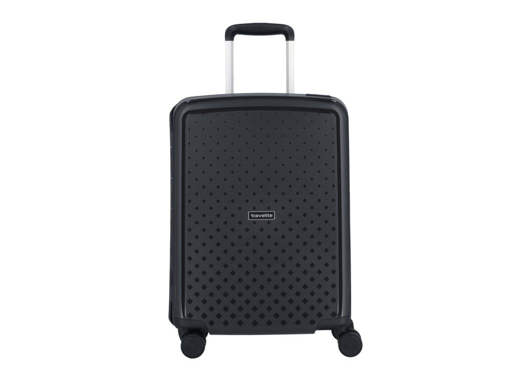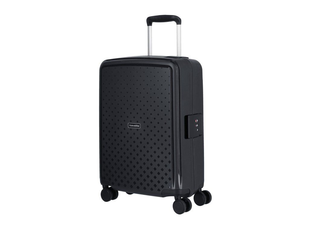 Robustní moderní plastový zámkový kufr 54 cm německé značky Travelite série Terminal v černé barvě. Inovativní kufr s vnitřním rámem, zvenčí umístěnou výsuvnou rukojetí a zavíráním bez zipu.