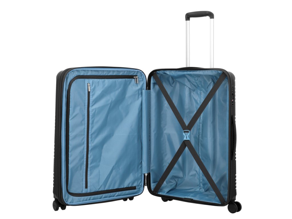 Cestovní skořepinový kufr německé značky Travelite v klasické černé barvě. Kufry série Zenit mají zajímavou a moderní strukturu a jsou vyrobeny z vysoce kvalitního materiálu polypropylen, který se vyznačuje nízkou hmotností a výbornou odolností vůči mechanickému poškození.