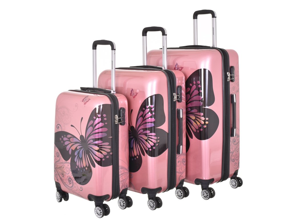 Set 3 ks cestovních kufrů francouzské značky Madisson ve zlato růžové barvě s motivem letícího motýla. Mají jedinečný vzhled, který jej odlišuje od ostatních zavazadel svým neobvyklým a barevným potiskem. Jedná se o vylepšenou verzi kufrů oblíbeného designu. Motiv na kufrech je plastický. Kufry jsou odolné vůči nešetrnému zacházení.