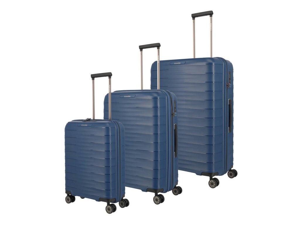 Set 3 ks plastových cestovních kufrů německé značky Travelite série Mooby v atraktivní modré barvě. Vydejte se na cesty stylově a spolehněte se na kvalitní kufry firmy Travelite, které jsou vyrobeny z velmi odolného materiálu polyproplylenu.