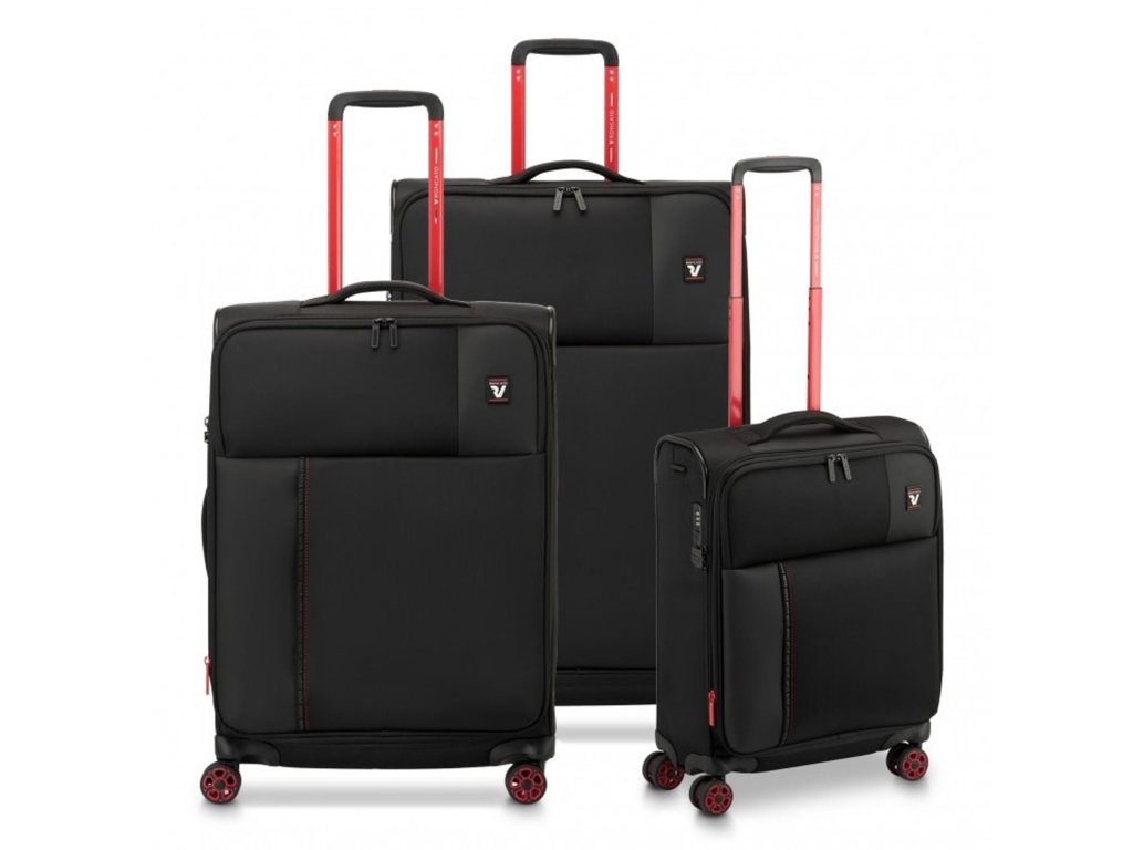 Set 3 ks textilních cestovních zavazadel italské značky Roncato série Move Soft v černé barvě s červenými doplňky. Tyto elegantní kufry v sobě skrývají mnoho prostoru a je možnost navíc rozšířit jeho objem u všech velikostí, což ocení zejména aktivnější cestovatelé. Kvalitní zpracování a moderní design se snoubí s funkčností, lehkostí a precizními užitými materiály.