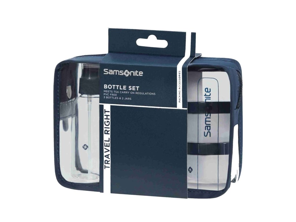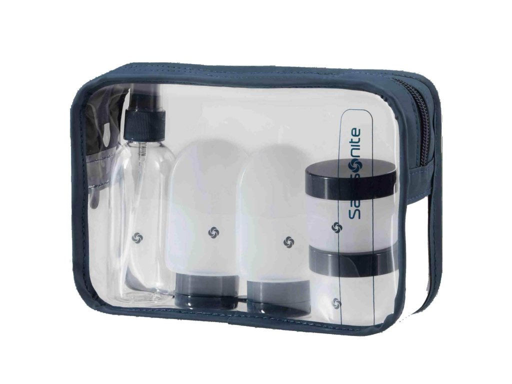 Cestovní 5 dílná sada značky Samsonite na kosmetiku v průhledném pouzdru. Praktická cestovní sada od značky Samsonite, která ti usnadní balení kosmetiky i dodržení letištních limitů na tekutiny. Vše je uložené v odolném, průhledném pouzdře na zip, takže bezpečnostní kontrolou projdeš bez zbytečného zdržování. Lahvičky a dózy jsou opakovaně použitelné a snadno se znovu naplní.