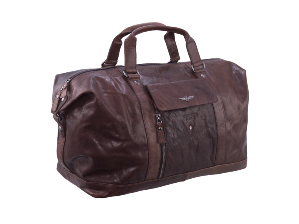 Cestovní taška weekender italské luxusní značky Aeronautica Militare série Vintage v hnědé barvě z pravé kůže.