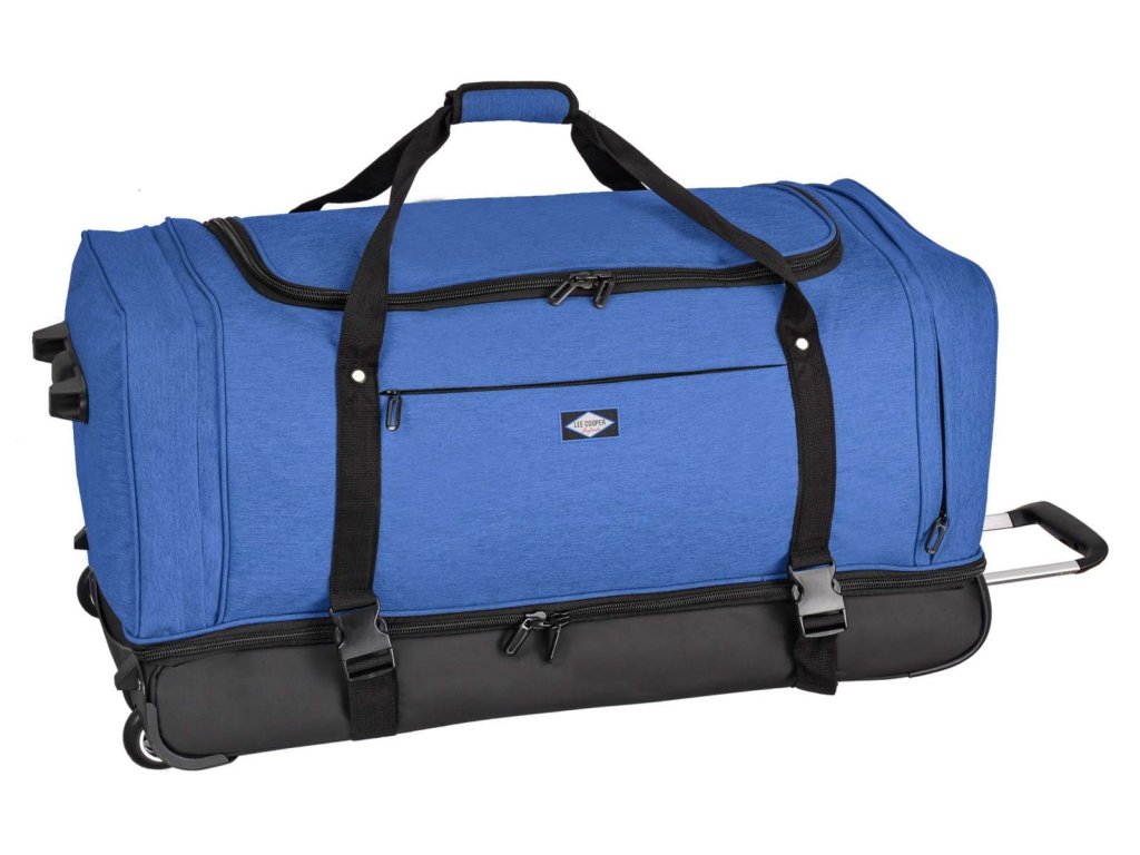 Všestranná cestovní textilní taška 80 cm na kolečkách v modré barvě značky Lee Cooper. Funkční cestovní taška vyrobená z vysoce kvalitních materiálů: 900D polyester pro horní část a strukturované PVC pro spodní část, která je odolná a voděodolná.