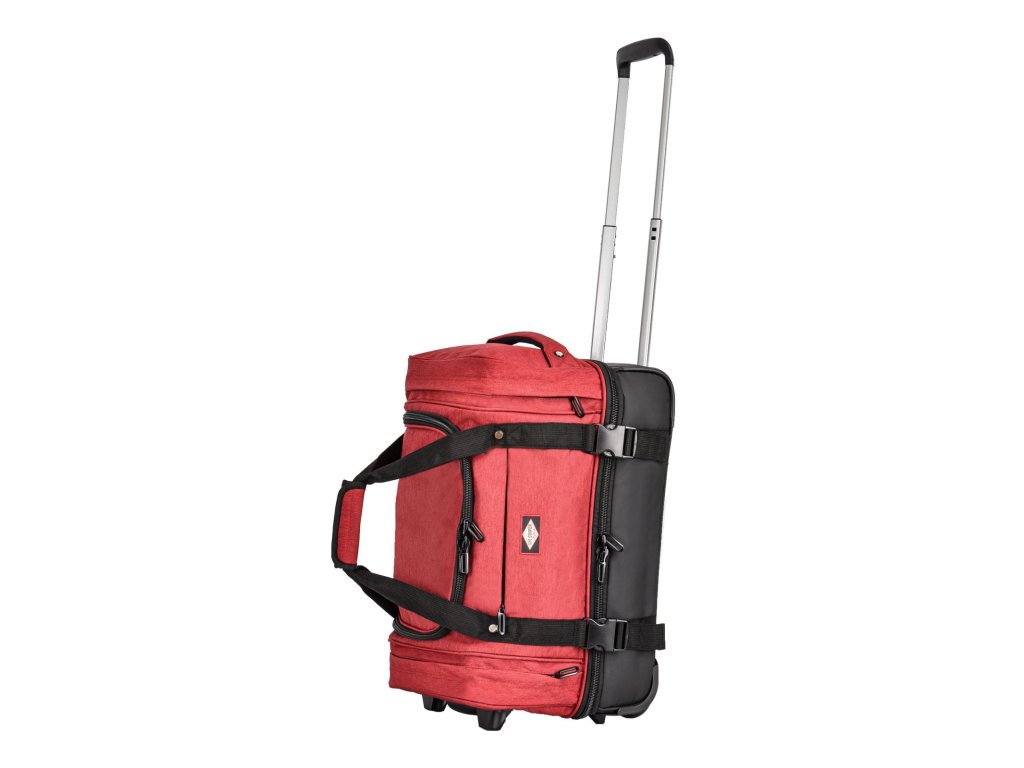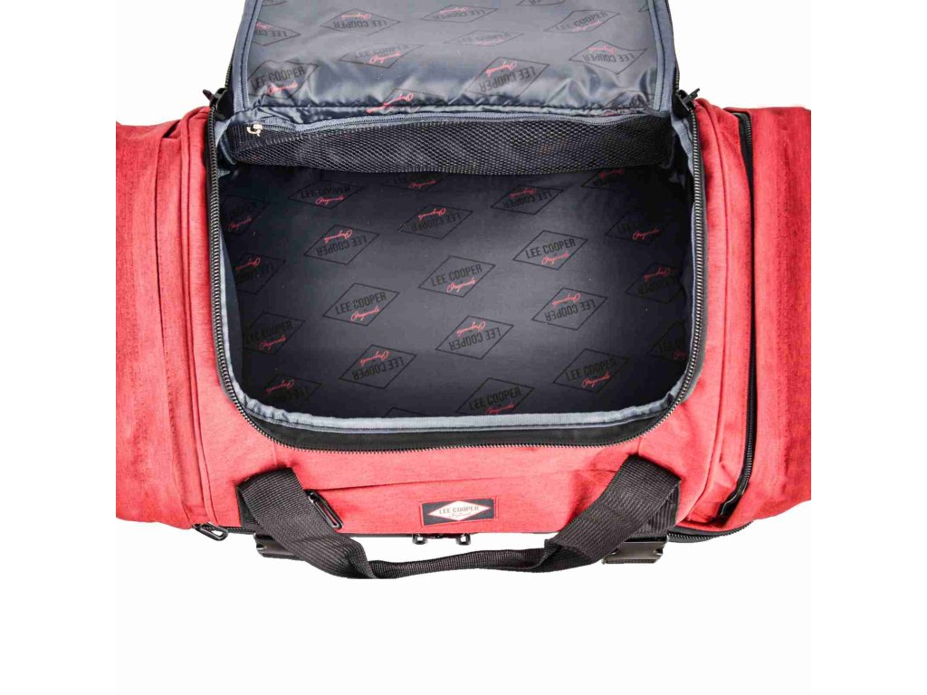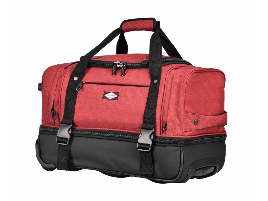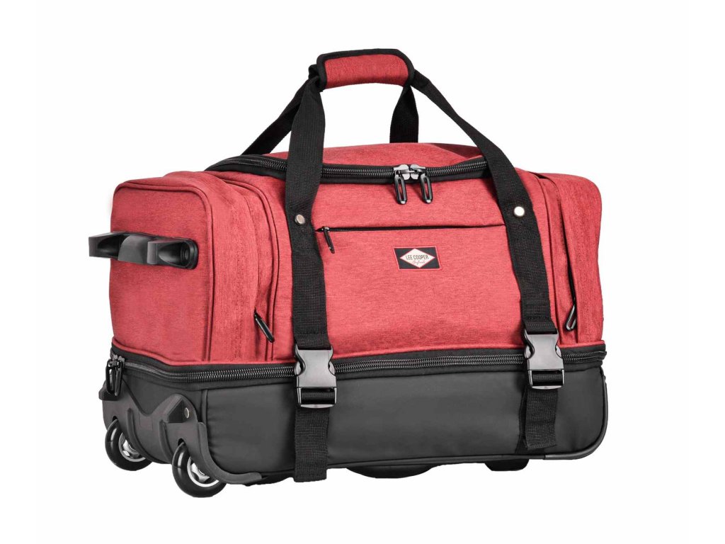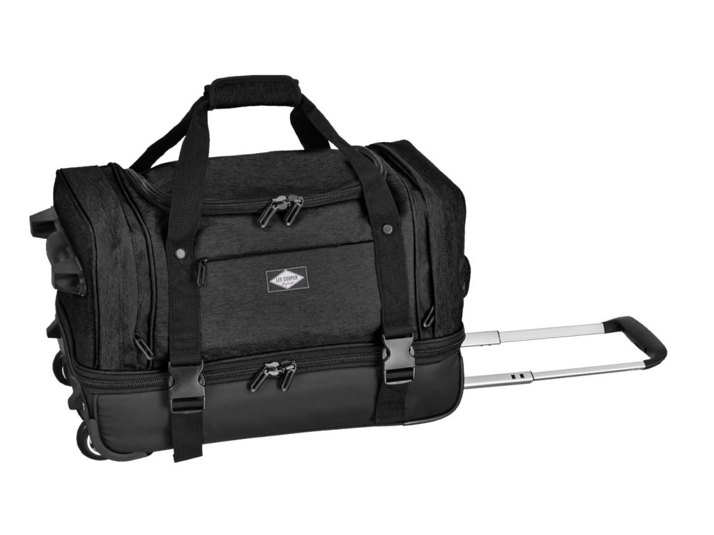 Všestranná cestovní textilní taška 50 cm na kolečkách v oblíbené černé barvě značky Lee Cooper. Funkční cestovní taška vyrobená z vysoce kvalitních materiálů: 900D polyester pro horní část a strukturované PVC pro spodní část, která je odolná a voděodolná.