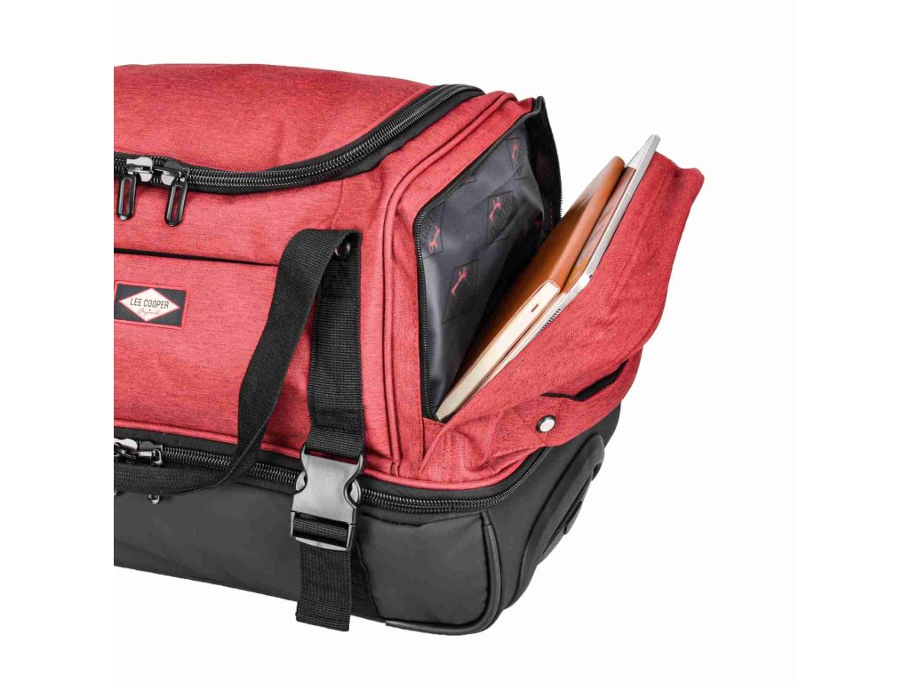 Všestranná cestovní textilní taška 50 cm na kolečkách ve světle šedé barvě značky Lee Cooper. Funkční cestovní taška vyrobená z vysoce kvalitních materiálů: 900D polyester pro horní část a strukturované PVC pro spodní část, která je odolná a voděodolná.