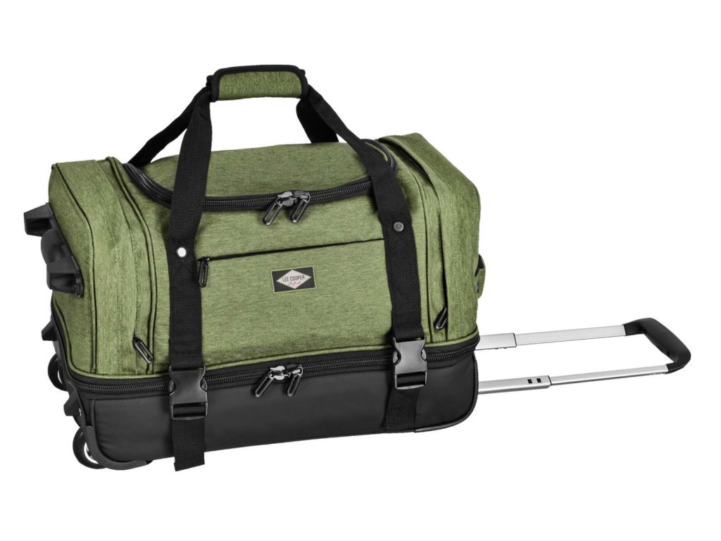 Všestranná cestovní textilní taška 50 cm na kolečkách v zelené barvě značky Lee Cooper. Funkční cestovní taška vyrobená z vysoce kvalitních materiálů: 900D polyester pro horní část a strukturované PVC pro spodní část, která je odolná a voděodolná.