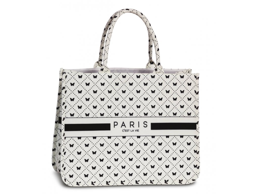 Dámská taška na nákupy nebo na pláž značky Fabrizio v moderním designu v bílé barvě s potiskem černých motýlků a s nápisem Paris. Přivítejte léto v novém stylu s novou taškou! Taška je vhodná na nákupy, na výlety k bazénu apod. Moderní vzhled tašky lahodí každému ženskému oku.