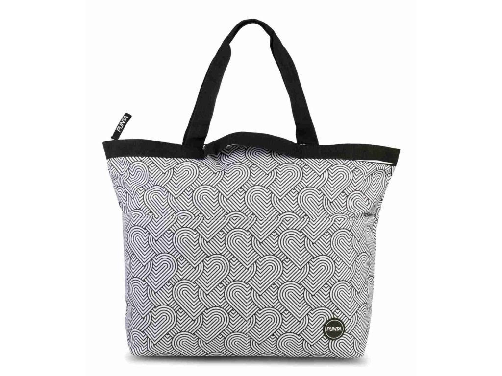 Multifunkční velká taška značky Fabrizio série Punta Big XXL v černé a bílé barvě s potiskem srdíček. Vydejte se na nákupy s touto moderní taškou, nebo tašku můžete samozřejmě využít i jinak, třeba při návštěvách známých nebo na kratší cesty.