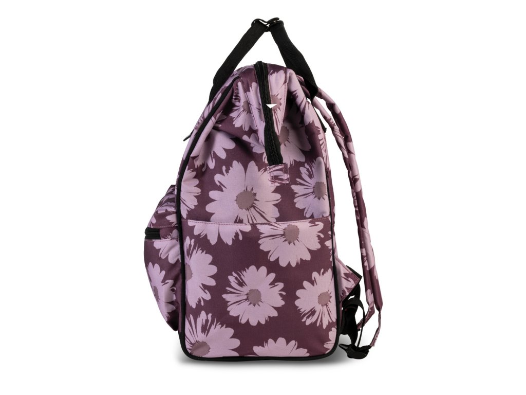 Stylový dámský městský batoh značky Punta v kombinaci tmavě a světle fialové barvy s výrazným květinovým vzorem. Tento trendy batoh je vhodný pro dívky i ženy. Dvě poutka pro nošení v ruce navíc představují jedinečnost ve zpracování a batoh plně nahradí kabelku.