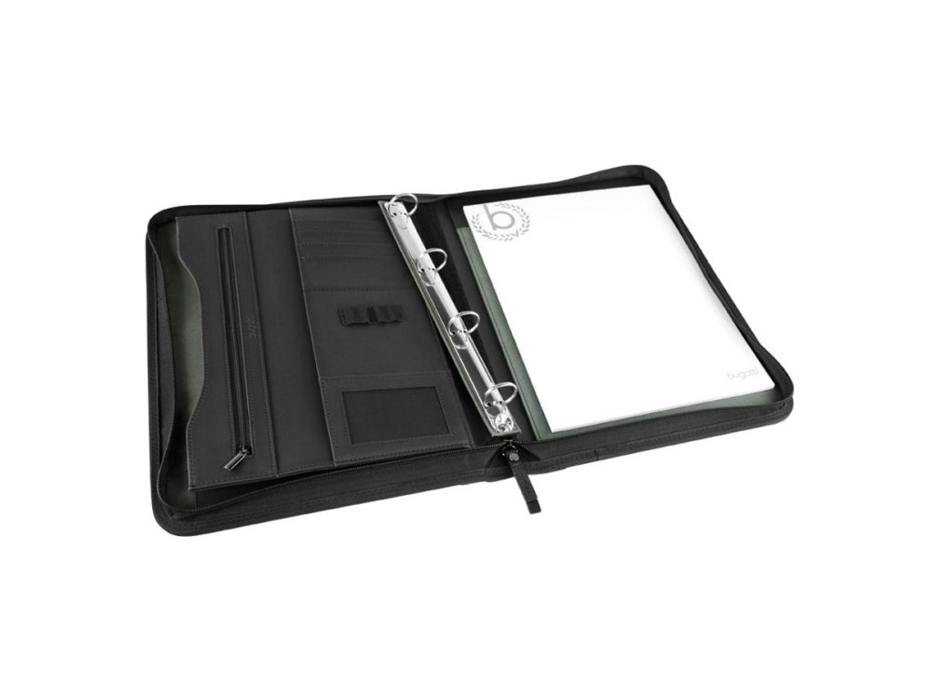 Pracovní desky s kroužky luxusní značky Bugatti v kombinaci kůže a textilu v oblíbené černé barvě. Sháníte stylové desky na poznámky? Do práce, na poradu nebo schůzky? Neváhejte a vybírejte tyto velmi kvalitní desky od Bugatti.