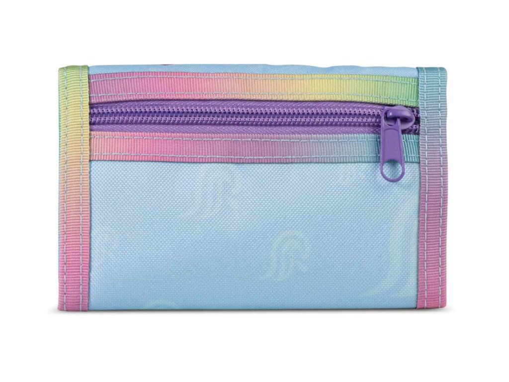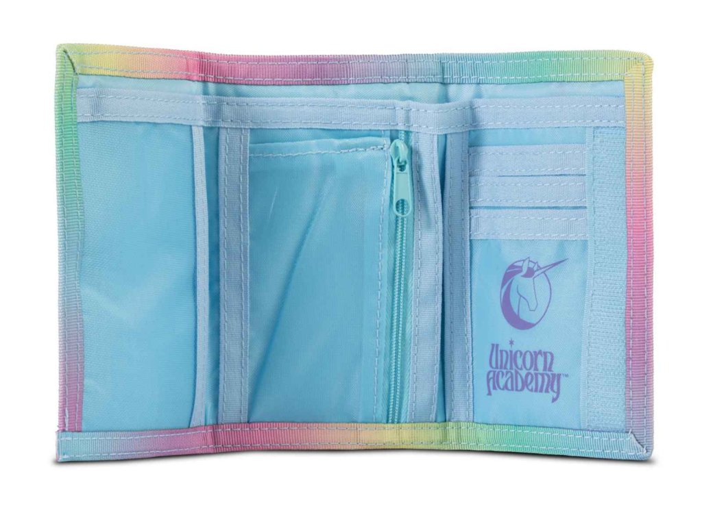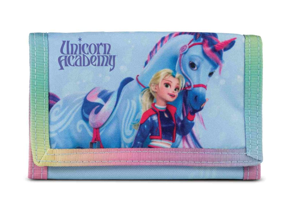 Textilní peněženka německé značky Fabrizio série Unicorn academy ve světle modré barvě s motivem jednorožce. Stylová dětská peněženka s motivem Unicorn Academy v modrém provedení je ideální pro malé fanynky kouzelného světa jednorožců. Pohádková ilustrace s hrdinkou série a jejím jednorožcem v kombinaci jemných pastelových barev působí hravě, ale ne kýčovitě – přesně to, co děti baví a rodiče tolerují. Peněženka je navržená pro každodenní používání. Nabízí prostor na bankovky, mince i karty a díky pevnému zapínání zůstane obsah bezpečně na svém místě. Kompaktní rozměry zajistí, že se snadno vejde do školní aktovky, batohu i malé kabelky. Skvělá volba na kapesné, první úspory i malé poklady, které prostě musí být pořád u sebe.