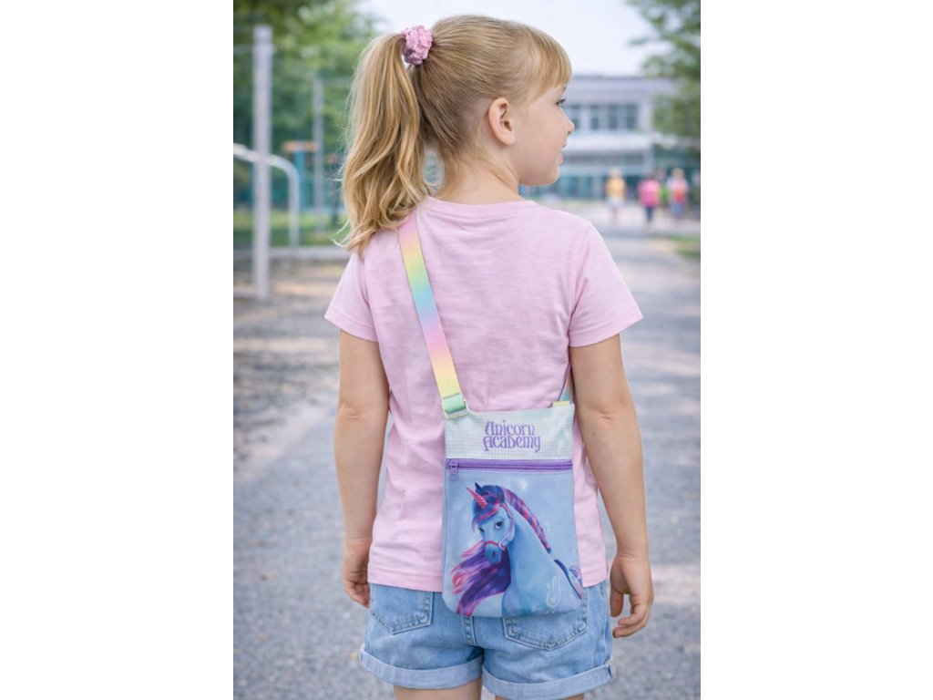 Dětská cross textilní taška německé značky Fabrizio série Unicorn academy ve světle modré barvě s motivem jednorožce. Roztomilá dětská crossbody taška s motivem kouzelného jednorožce z Unicorn Academy okouzlí každou malou milovnici pohádek a fantazie. Jemné pastelové barvy, výrazný jednorožec a duhový ramenní popruh vytvářejí kombinaci, která funguje jak na výletě, tak při běžném nošení. Taška je lehká, skladná a praktická – pojme všechny důležité drobnosti, jako je mobil, klíče nebo kapesníčky. Hlavní kapsa se zipem udrží obsah bezpečně uložený a nastavitelný popruh umožní pohodlné nošení přes rameno i křížem přes tělo. Skvělá volba na výlety, procházky i volný čas – malá taška, která přinese velkou radost.