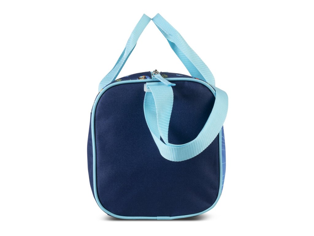Dětská taška pro milovníky animované pohádky Tlapková patrola značky Fabrizio v tmavě modré barvě do ruky i přes rameno. Sportovní tašku zdobí veselý Chase z Tlapkové patroly, oblíbený psí policista. Přední panel tvoří velký obrázek Chase v akční póze, doplněný o policejní symboly, šachovnicový pruh a siluetu velitelské věže Paw Patrol. Pozadí je laděné do světle modré s dynamickými paprsky, které motivu dodávají energii. Máte doma dítko, které tuto animovanou pohádku doslova hltá? Pak mu pořiďte tuto praktickou cestovní tašku.