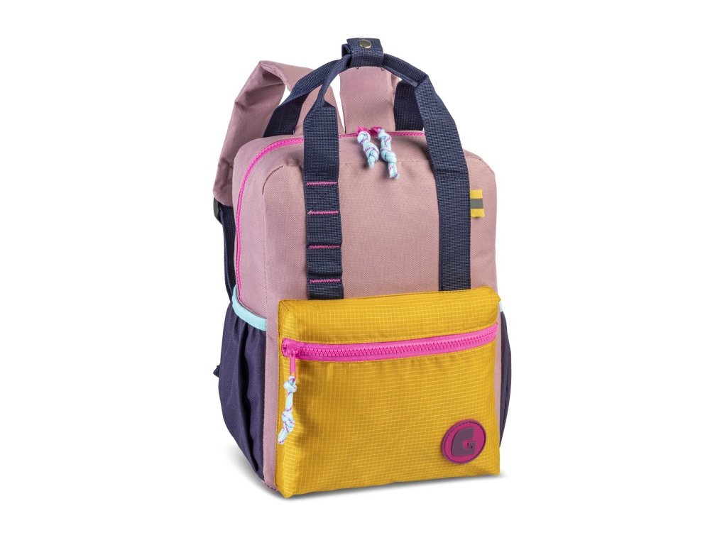 Dětský batoh GLUH WURMCHEN Luca v distribuci německé značky Sieber v kombinaci růžové a okrové barvy. Batoh je lehký, funkční a pohodlný.