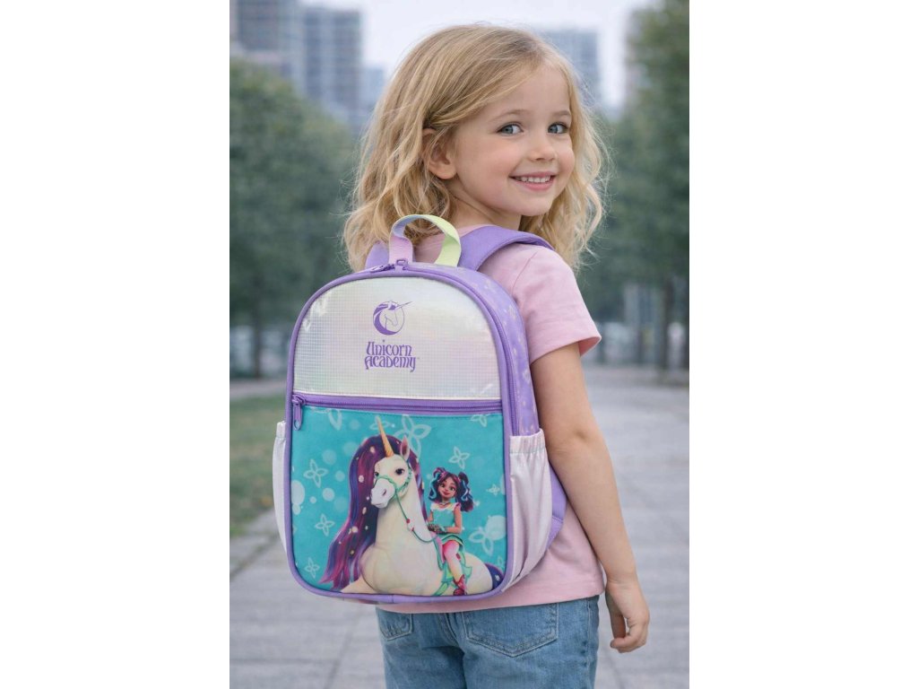 Dětský batůžek německé značky Fabrizio série Unicorn academy shiny v zajímavé petrolejové barvě s motivem jednorožce. Úspěšná série Unicorn Academy okouzluje děti po celém světě – a spolu s ní roste i poptávka po kvalitních licencovaných produktech. Nechte děti vstoupit do kouzelného světa Unicorn Academy, plného přátelství, fantazie a magických jednorožců. Batoh zdobí kouzelný motiv Unicorn Academy s jemnými pastelovými barvami, který zaujme na první pohled. Ústředním prvkem je bílý jednorožec s barevnou hřívou a hrdinka z kouzelného světa Unicorn Academy, doplněné o drobné květinové a dekorativní prvky, které motivu dodávají lehkost a hravost. Barevná kombinace petrolejové, fialové a duhových odstínů působí svěže, moderně a zároveň velmi přívětivě pro dětské oko. Motiv je vyvážený, nepůsobí přeplácaně a je ideální pro malé fanynky jednorožců, pohádek a kouzelných dobrodružství.