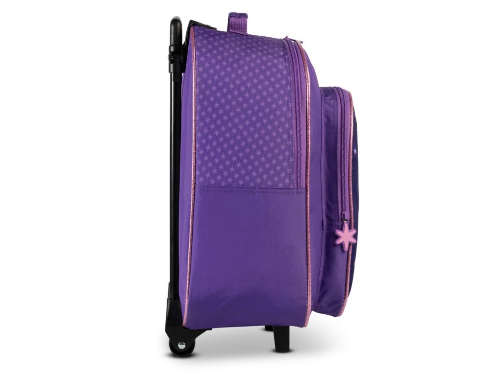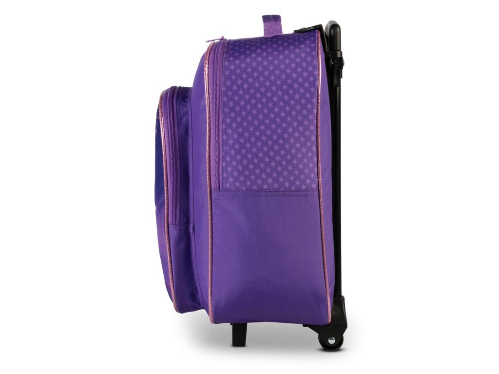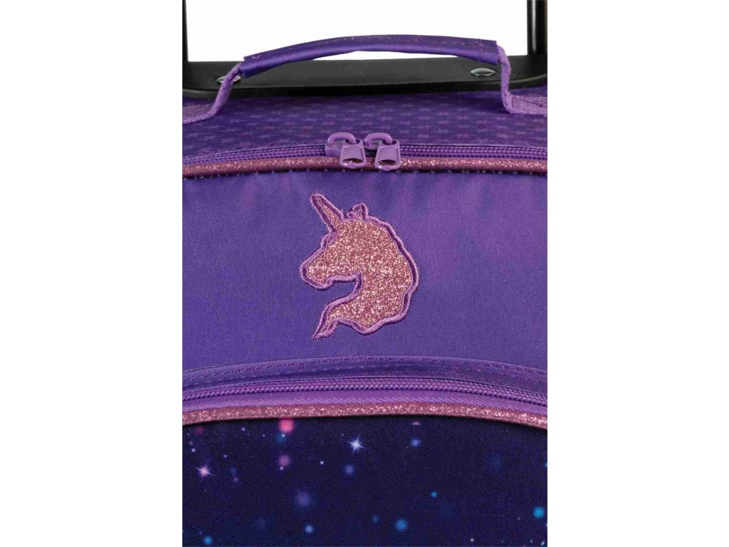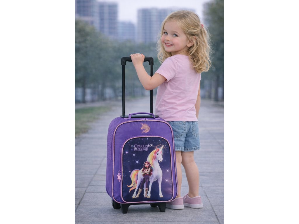 Dětský cestovní kufr se dvěma kolečky německé značky Fabrizio série Unicorn academy ve fialové barvě s motivem jednorožce s barevnou hřívou. Dětský kufr Unicorn Academy zaujme na první pohled kouzelným fantasy motivem, který si zamiluje každá malá cestovatelka. Přední stranu zdobí ilustrace dívky stojící po boku majestátního jednorožce s duhovou hřívou, zasazená do temně fialového, hvězdami posetého pozadí. Motiv působí pohádkově, klidně a zároveň dobrodružně – přesně ve stylu světa Unicorn Academy. Fialové barevné provedení je doplněno jemnými třpytivými detaily a decentním lemováním v růžovo-zlatém tónu, které dodává kufru elegantní a hravý vzhled. Nechybí ani malé logo Unicorn Academy a roztomilé detaily, jako je přívěsek ve tvaru hvězdičky. Celkově motiv působí harmonicky, není přeplácaný a je ideální pro děti, které milují jednorožce, fantazii a pohádkové příběhy. Kufr je díky tomu nejen praktickým zavazadlem, ale i stylovým doplňkem na cesty, dovolené nebo víkendová přespání.