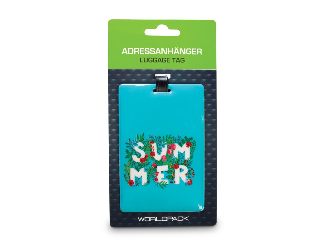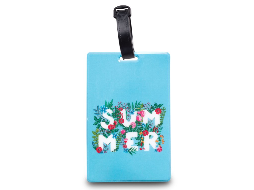 Designová plastová visačka 1 ks v tyrkysové barvě s nápisem Summer na kufr nebo jiné zavazadlo pro označení a identifikaci.