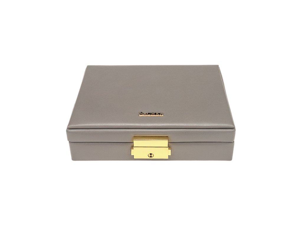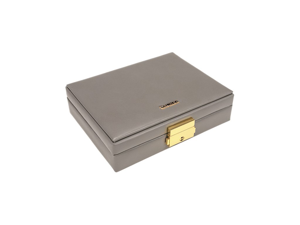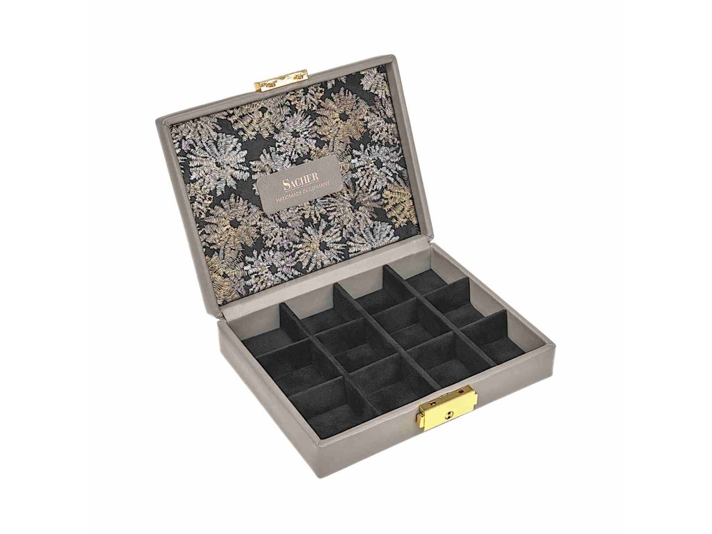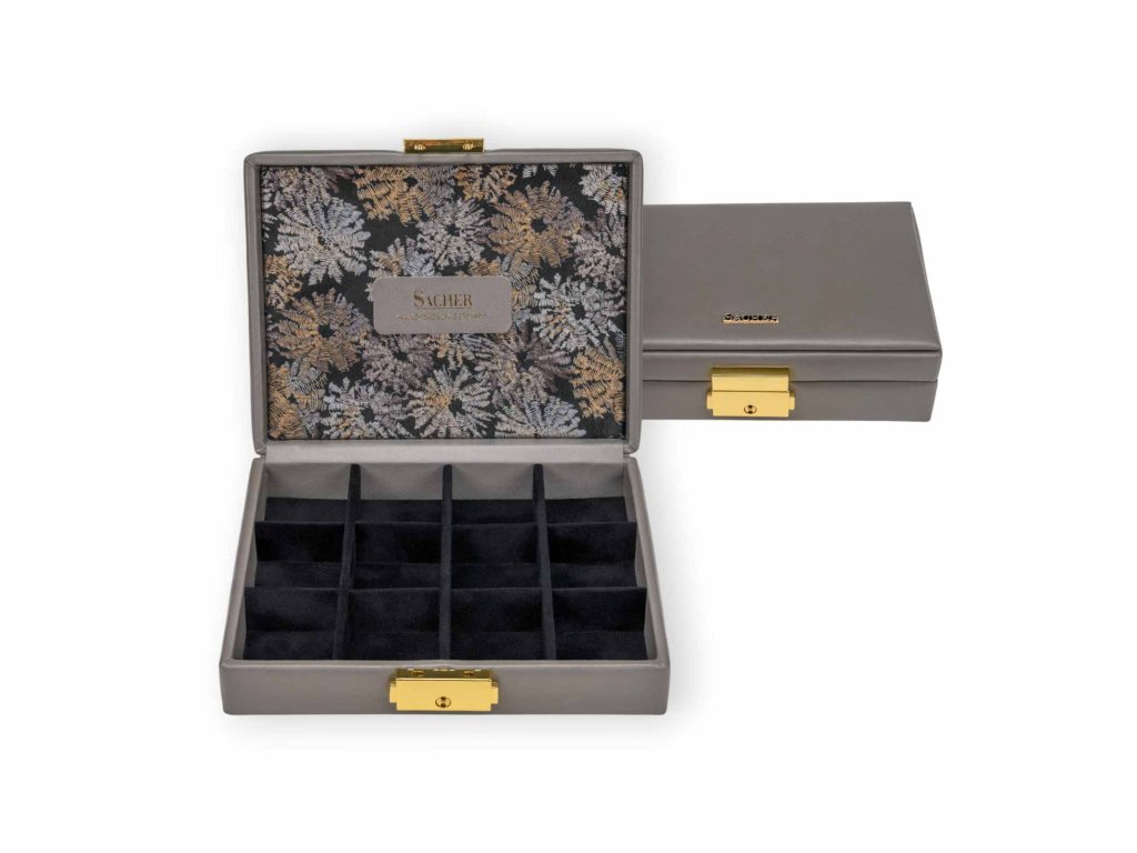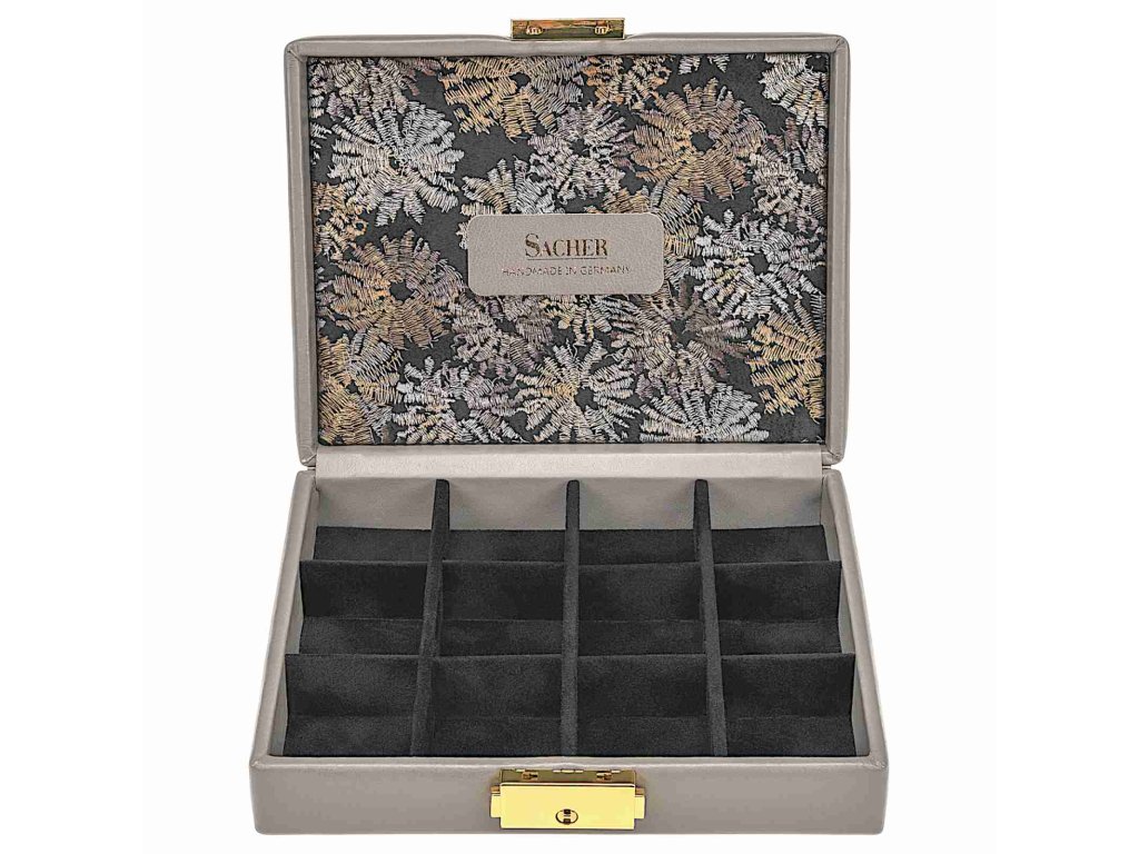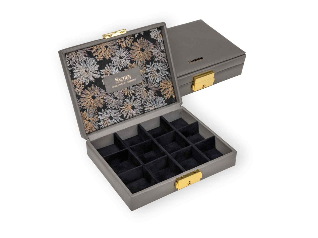 Elegantní kazeta na šperky pro moderní ženy německé značky Sacher v šedé barvě s květinovými vzory na vnitřní straně. Uzamykatelná kazeta od SACHER pro přehledné uložení sběratelských předmětů a šperků. Extrémně odolné, v plochém provedení vhodné i pro trezory. Jsou vyrobeny z pravé italské celokožené hovězí kůže měkké jako rukavice.