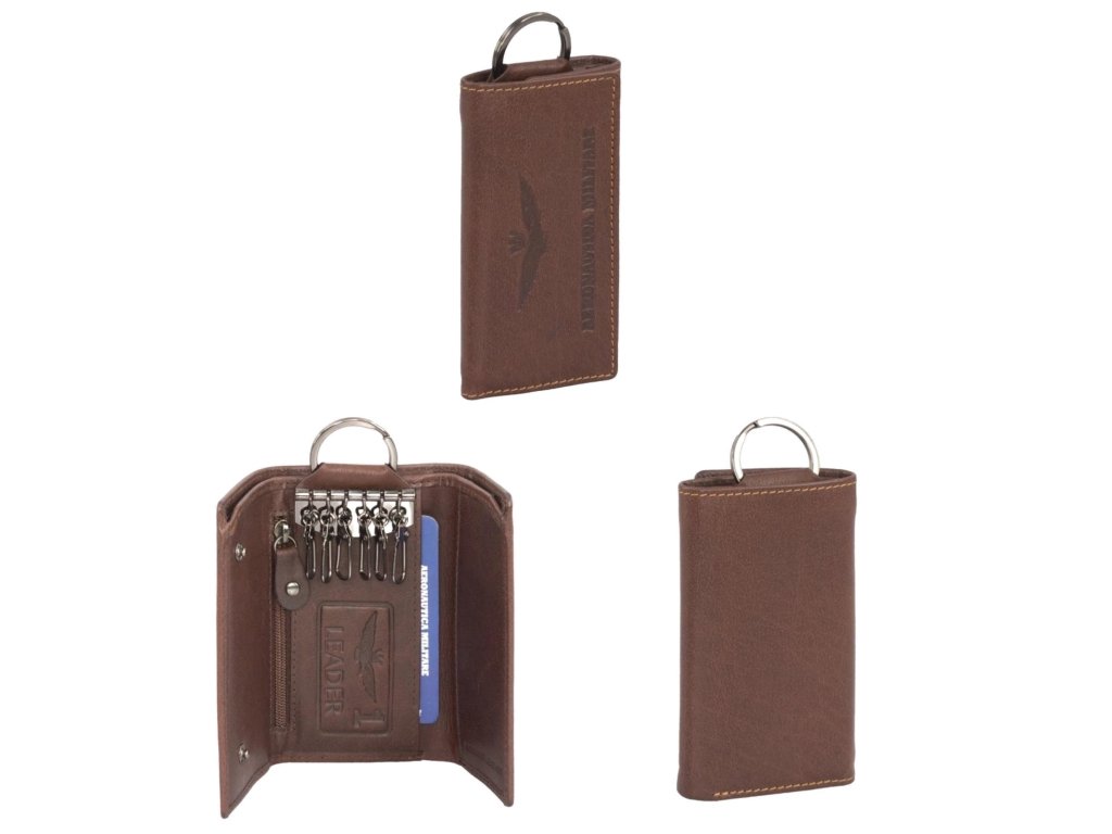 Kožená stylová klíčenka italské prestižní značky Aeronautica Militare série New Eagle v hnědé barvě. Vyrobeno z vysoce kvalitní kůže s vintage efektem – výrobky z řady New Eagle od značky Aeronautica Militare jsou ideálním doplňkem pro ty, kteří hledají styl i praktičnost. Na přední straně vyniká reliéfní logo s křídly, které dodává klíčence výrazný a elegantní charakter. Kontrastní švy a ruční zpracování podtrhují důraz na detail.