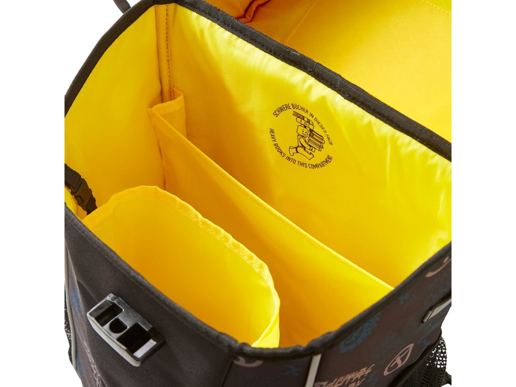 Velmi lehká a prostorná aktovka Easy Light má spoustu místa na knihy či sešity, svačinový box i penál. Taška má dvě praktické síťované boční kapsy, které lze použít na láhev s vodou či ovoce. K zajištění vysokého pohodlí při nošení najdete v aktovce vnitřní přihrádku pro těžší předměty, která je udrží u zad a zajistí tak rovnoměrné rozložení hmotnosti, dále ergonomický zádový panel a polstrované nastavitelné ramenní popruhy a nastavitelný hrudní popruh. Uvnitř v hlavní kapse najdete nejen rozvrh hodin, ale taky přezku na klíče, na kterou lze připojit například i LEGO peněženku či LEGO kapsičku. EASY školní aktovka má pevné víko s plastovým zámkem, které jde snadno otevřít jednou rukou. K udržení stability aktovky v případě, že má otevřené víko, jsou na spodní straně vystuženého dna umístěné plastové nožky, které zároveň aktovku chrání před špínou a vlhkem. Aktovka je vyrobena z materiálu odpuzujícího vodu a nečistoty, reflexní prvky jsou umístěné po všech stranách aktovky.