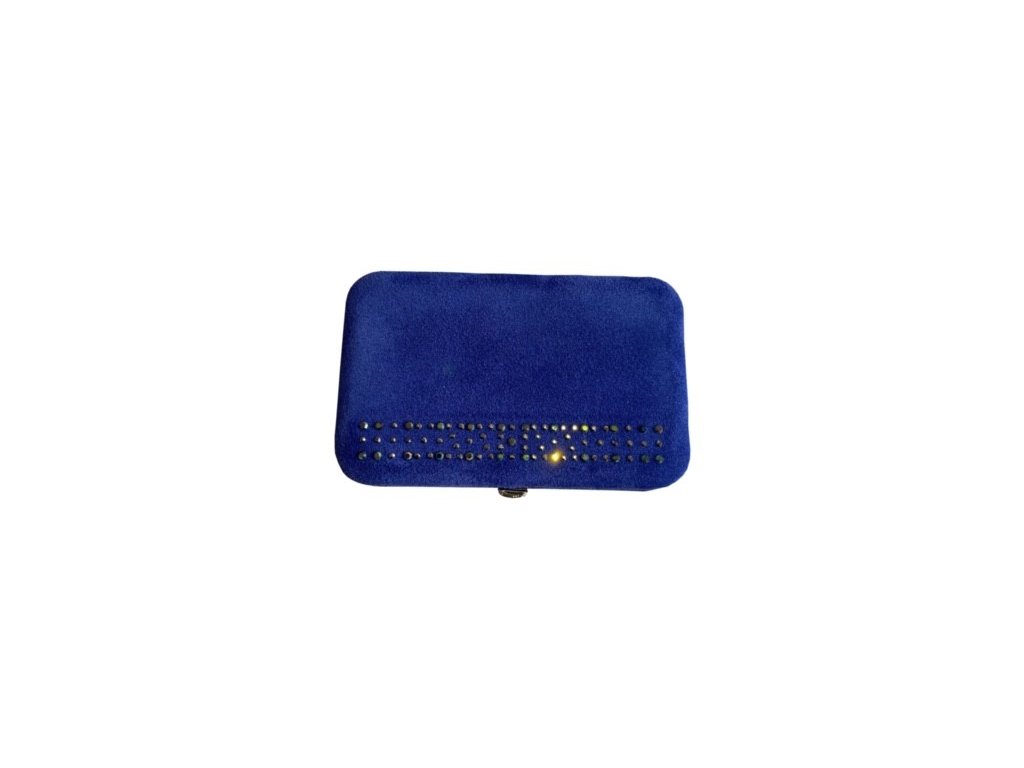 Elegantní rámová kožená 6 dílná manikúra značky Premium Line made in solingen se skleněným pilníkem v modré barvě s motivem z kamínků.